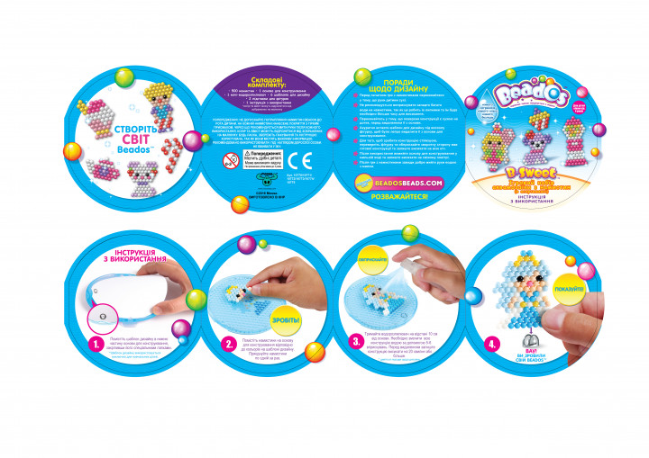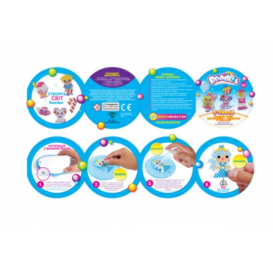 Acest set Beados "Dulciuri", promoveaza dezvoltarea imaginatiei si creativitatii copilului.Beados nu necesita adeziv. Este suficient sa stropesti figura cu apa obisnuita, cu ajutorul unui spray si sa lasi sa se usuce timp de 20-30 minute. Cu ajutorul modelelor de sabloane puteti crea 6 figuri tematice diferite sau puteti crea propriile imagini si figuri. Margelele de mozaic sunt foarte mici, cu un diametru de 3 mm, acest set va contribui la dezvoltarea abilitatilor motoricii fine, gindirea creativa si ofera o multime de placere din joc.