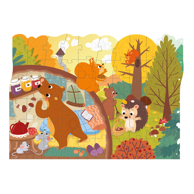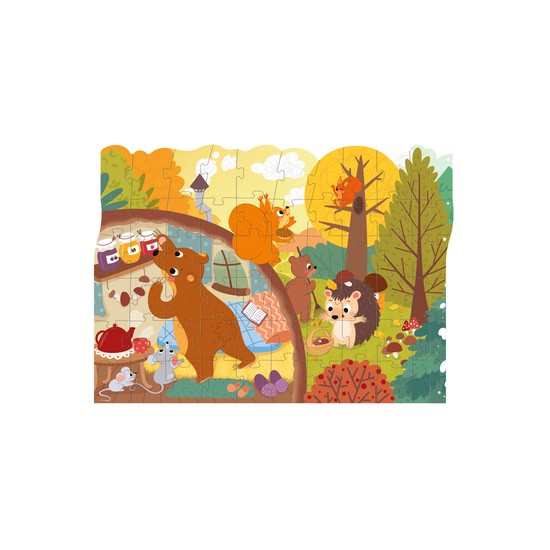 Vine toamna. Copacii sunt acoperiti cu aur, se recolteaza ultima recolta, iar ursul incepe sa se pregateasca pentru hibernare. Se aprovizioneaza cu dulceata, isi curata barlogul si prepara ceai aromat. Afla ce aduna pentru iarna si celelalte animalute din padure. Acest puzzle va dezvolta copiilor imaginatia, atentia si creativitatea.