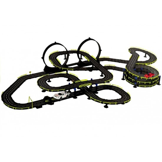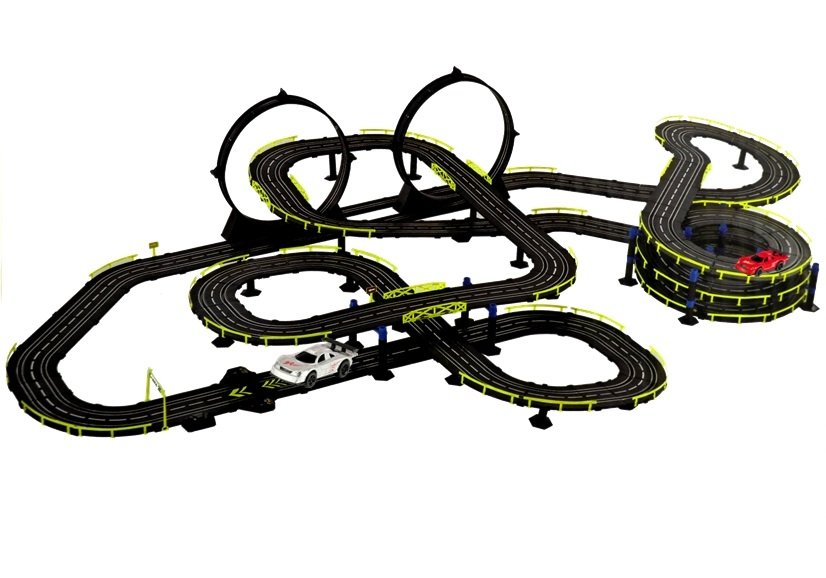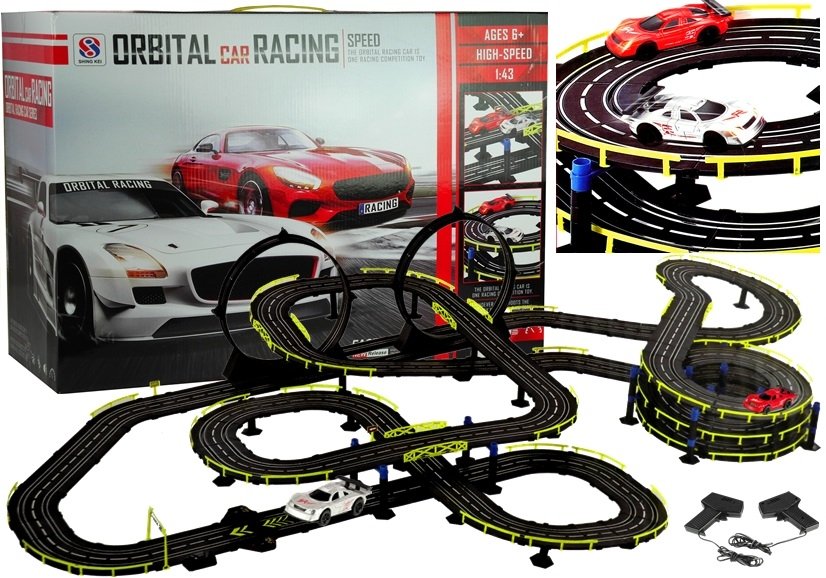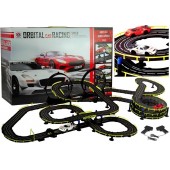 Setul include: doua masinute de curse la scara de 1:43, doua joystick-uri, o multitudine de elemente de constructie, o pista de curse.