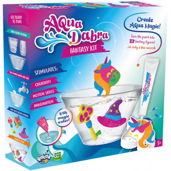 Creaza magie chiar la tine acasa cu setul de creatie AquaDabra! Transforma animalele create in figuri 3D in cateva secunde! AquaDabra este un set unic ce contine un bol special si un gel special. Umple bolul cu apa, adauga sare, creaza figurile animale cu ajutorul formele si gelului special, scufunda-le in apa magica si urmareste cum ca prin magie ele prind volum si devin 3D. De acum in colo vor innota in bolul special.