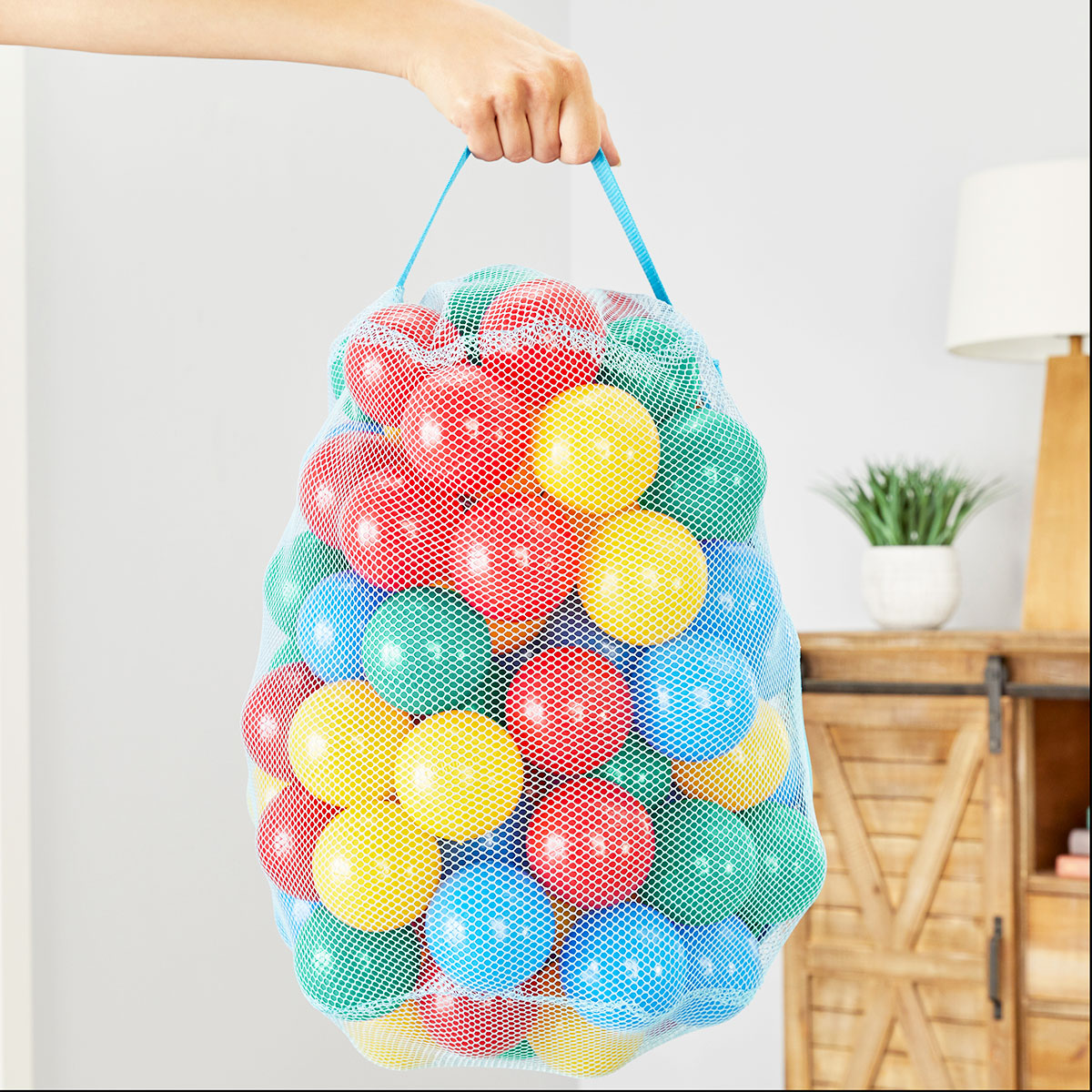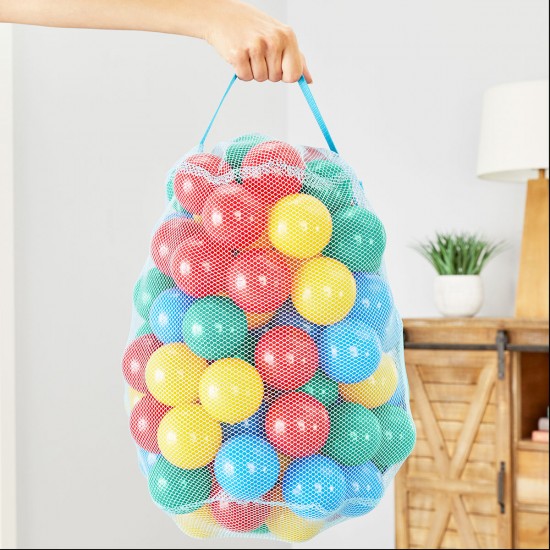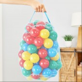 Setul include: 100 de bile multicolore, o punga din plasa cu fermoar.