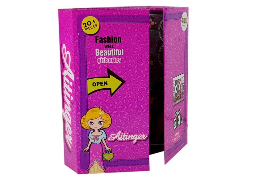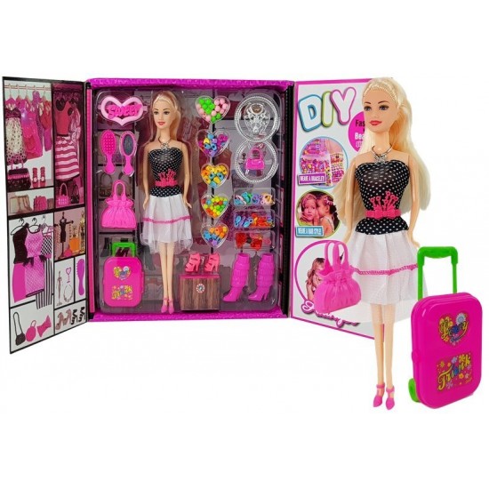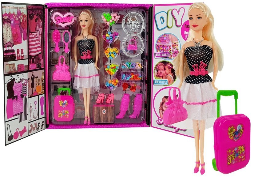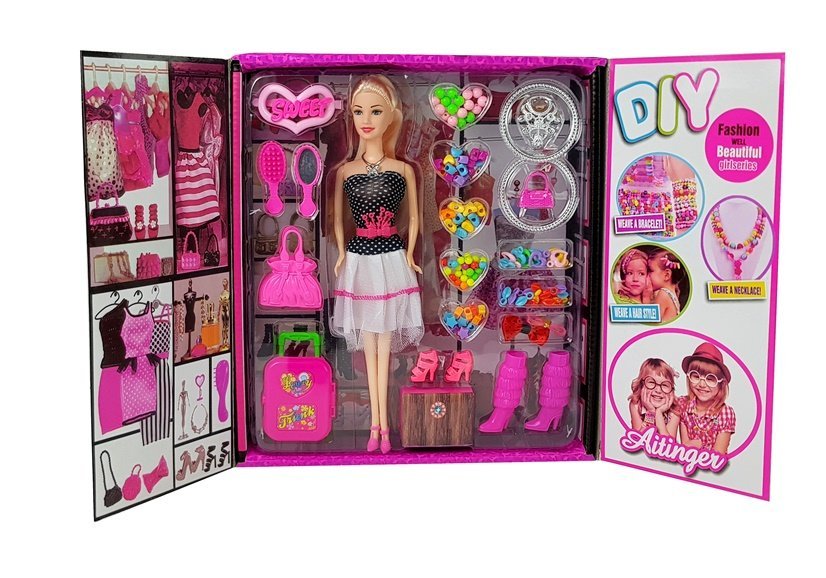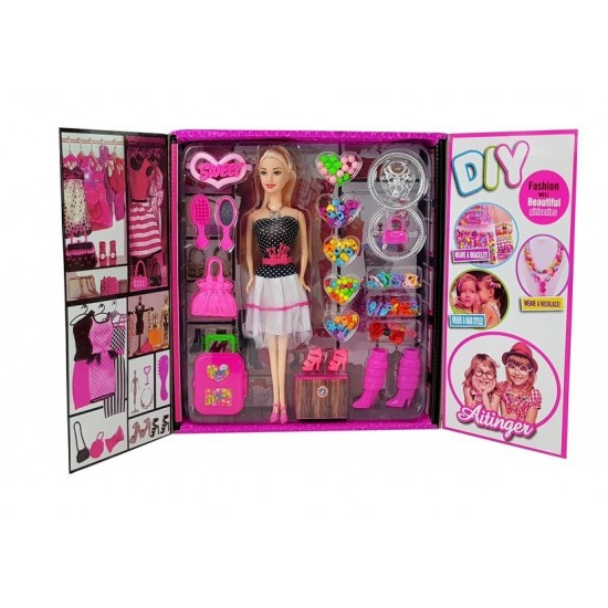 Setul prezentat este o propunere minunata pentru fetele mici carora le place sa se joace cu papusile si sa-si faca propriile modele de bijuterii. Setul consta dintr-un numar impresionant de accesorii - in interior exista o papusa frumoasa, cu parul deschis, care poate fi schimbata si decorata cu accesorii in functie de gustul dumneavoastra.