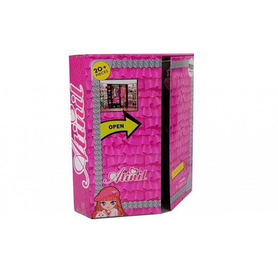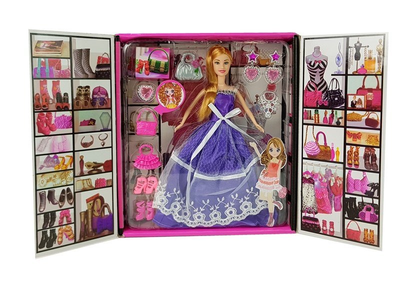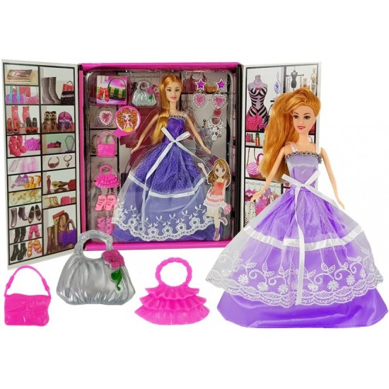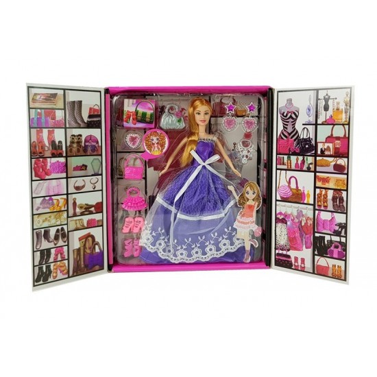 Setul include: o papusa, rochie violet, 3 genti de mana, pandantiv in forma de inima, cercei frumosi, lungi, cu inima si stea, colier de argint la gat.