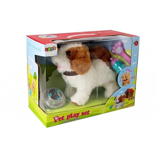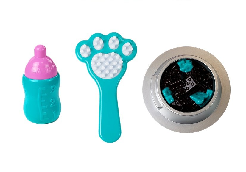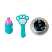 Setul include: un caine de plus, o perie pentru pieptanat, o sticla, un farfurie cu mancare.