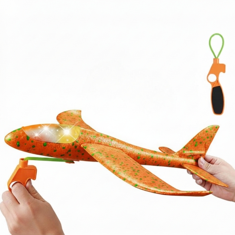 Avion PORTOCALIU din polistiren pentru copii cu lansare slingshot, cu lumini LED, jucarie exterior, ZJA293875