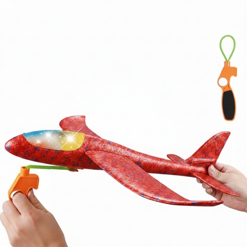 Avion ROSU din polistiren pentru copii cu lansare slingshot, cu lumini LED, jucarie exterior, ZJA293875