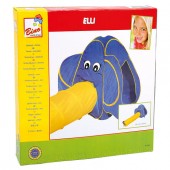 La un capat, cortul de joaca tip tunel este prevazut cu o usa mare de acces personalizata cu chipul unui elefant jucaus.