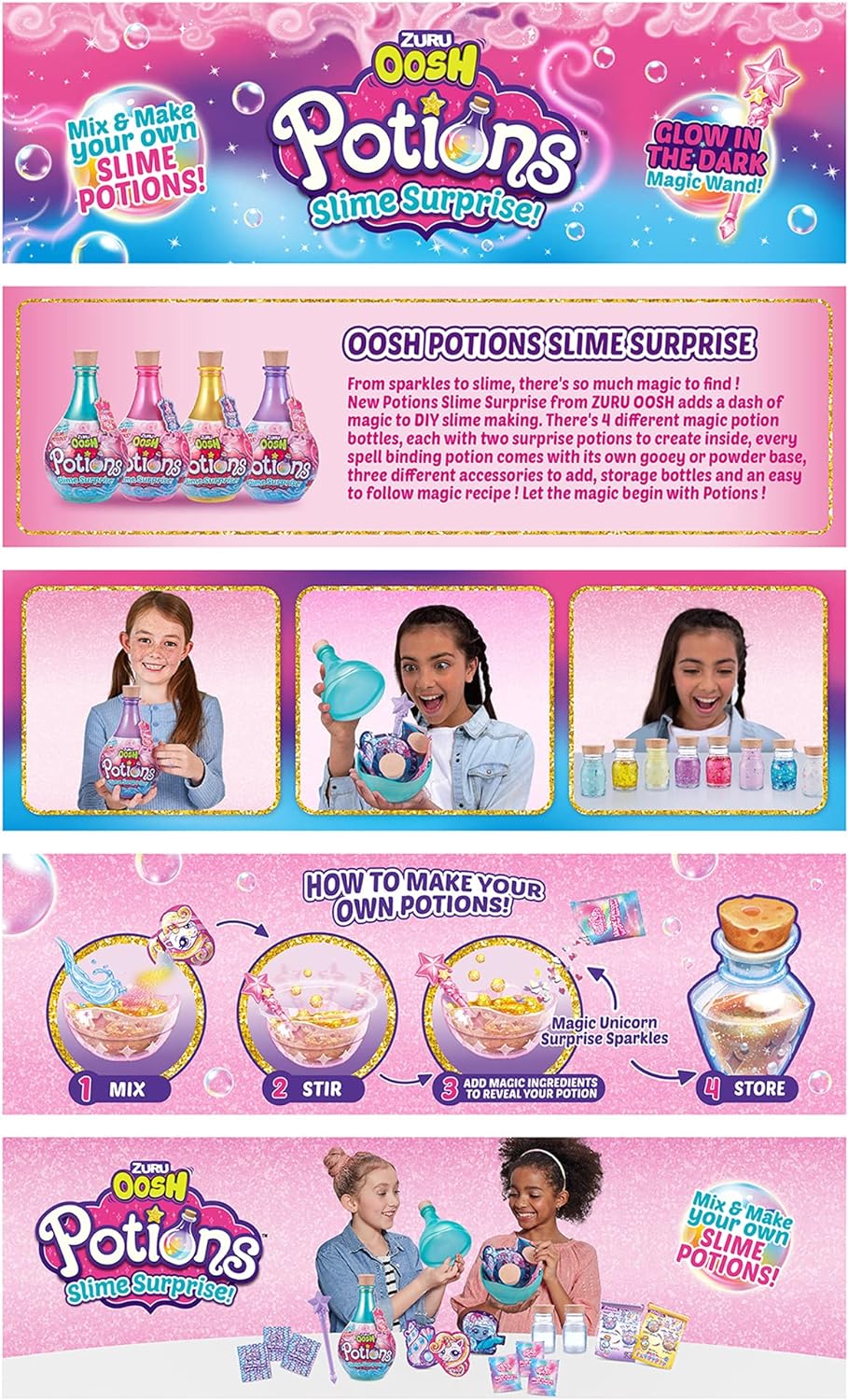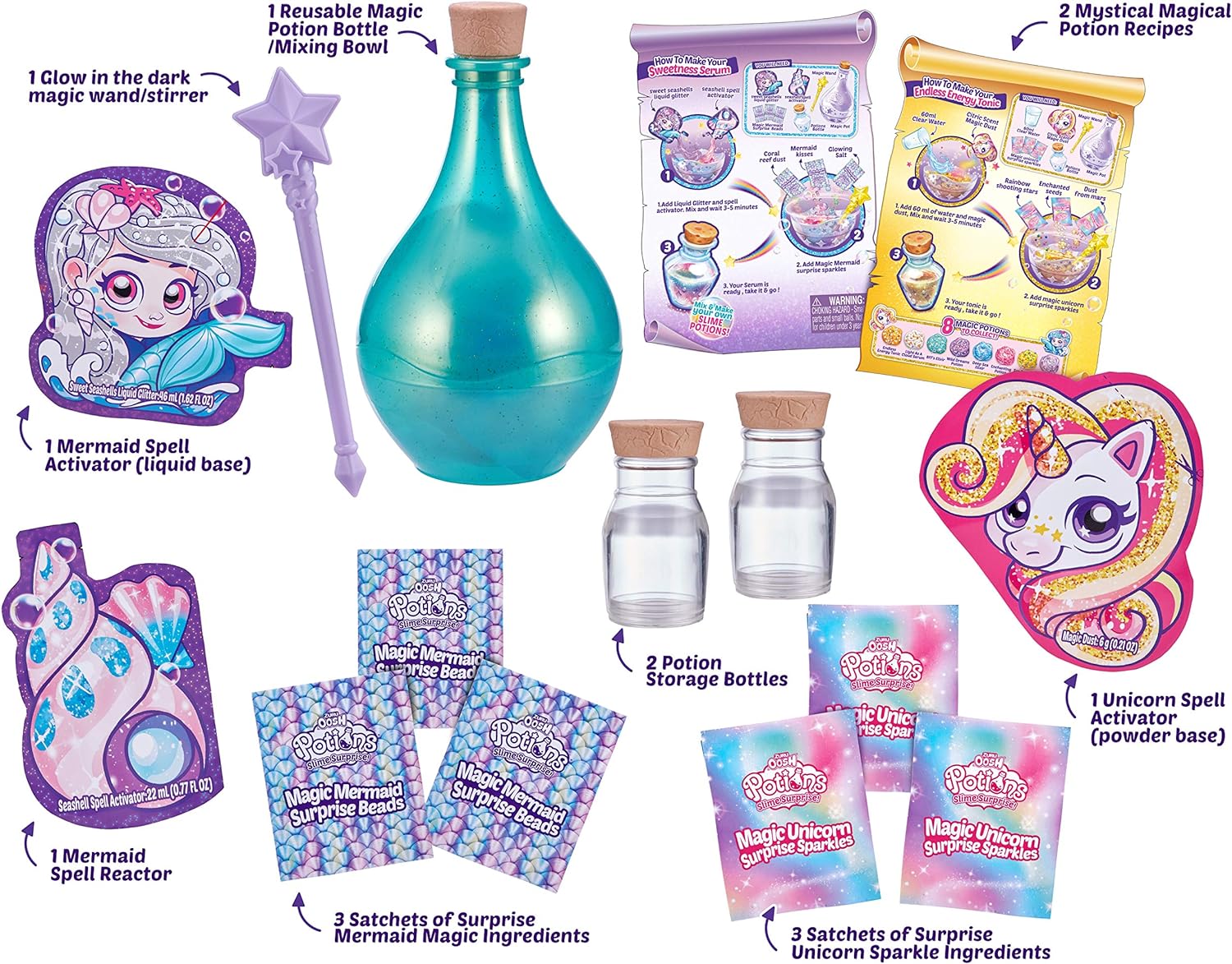 Exista 4 sticle de potiune magice diferite, fiecare cu doua sticlute surpriza perfecte pentru creatie.