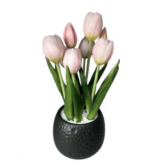 Lalele artificiale in ghiveci 32 cm, roz, model ZJA397012 sunt un aranjament decorativ modern si elegant, ideal pentru decorarea casei, biroului sau spatiilor comerciale. Buchetul contine mai multe lalele roz cu aspect natural si frunze verzi realiste, asezate intr-un ghiveci decorativ negru cu finisaj texturat si pietricele ornamentale albe.