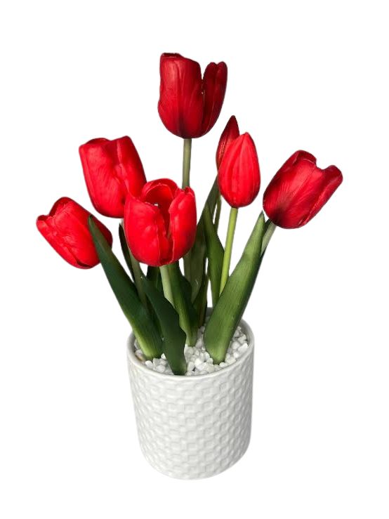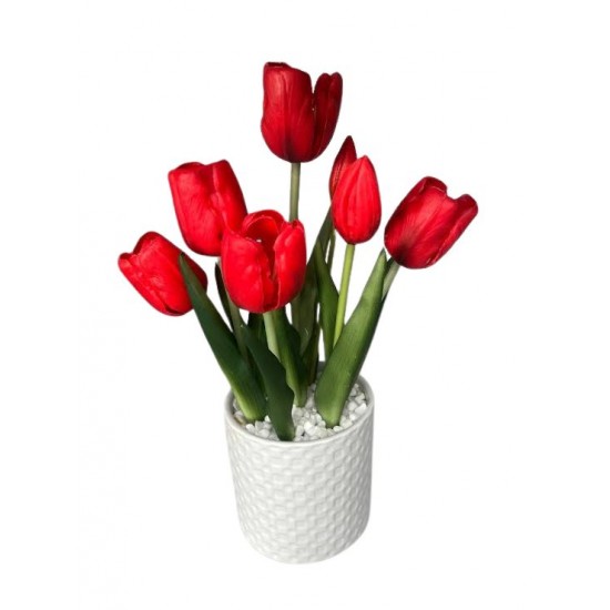 Lalele artificiale in ghiveci 32 cm, rosu, model ZJA397013 reprezinta un aranjament decorativ elegant si modern, ideal pentru decorarea casei, biroului sau spatiilor comerciale. Buchetul contine mai multe lalele rosii cu aspect natural si frunze verzi realiste, asezate intr-un ghiveci decorativ alb cu finisaj texturat si pietricele ornamentale.