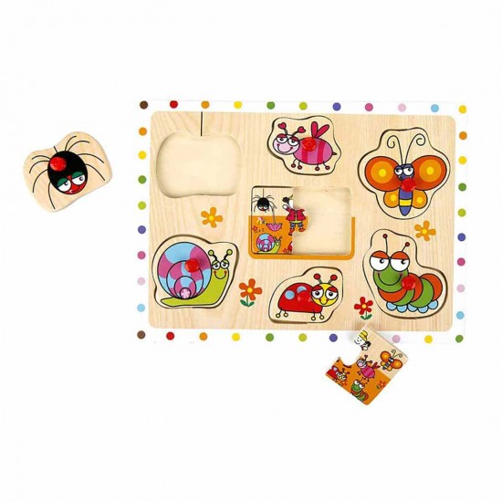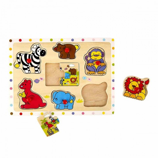 Puzzle din lemn cu buton Animale 22 x 2 x 16,5 cm, diverse tipuri Woody