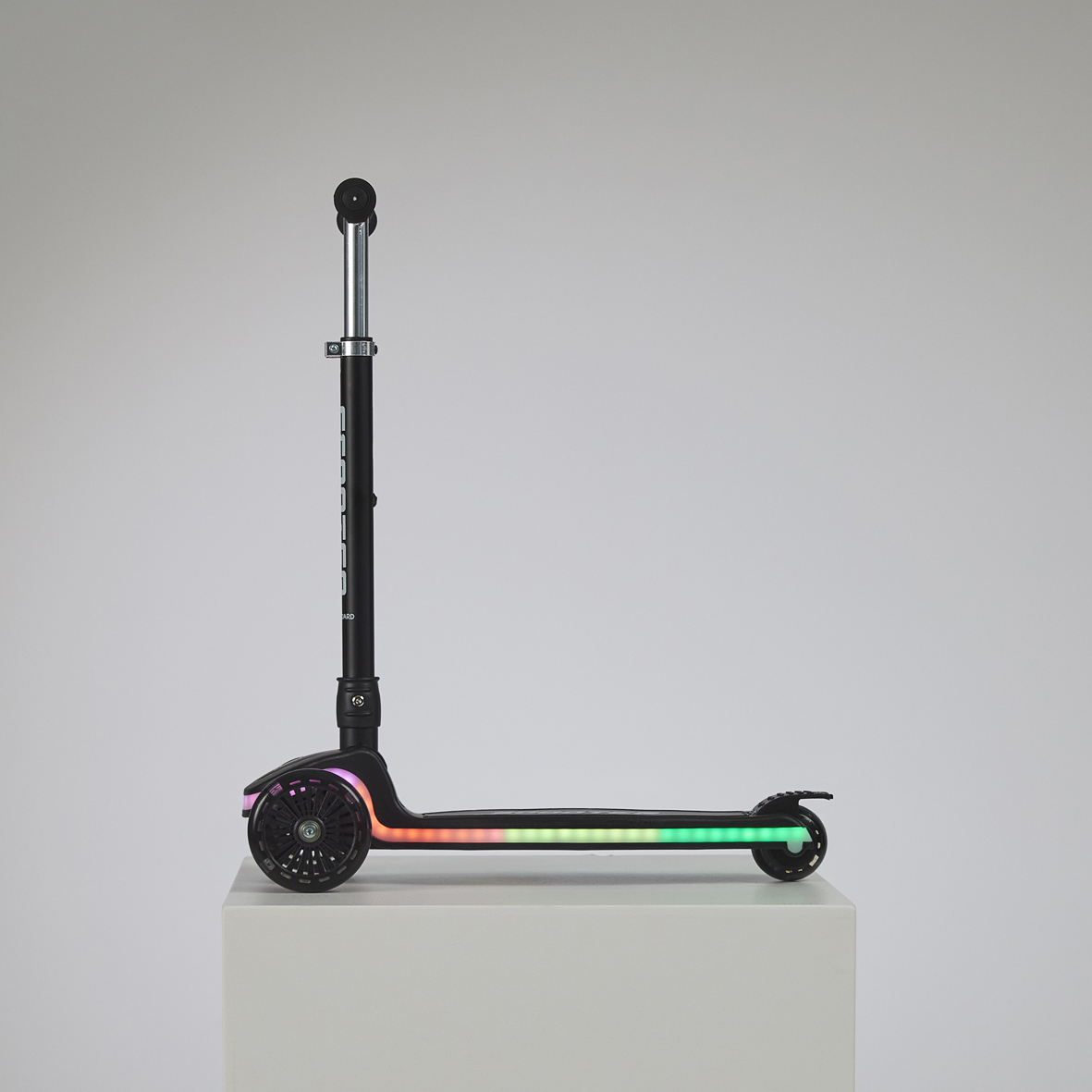 Platforma trotinetei este inconjurata de benzi LED colorate, care pot fi pornite cu ajutorul unui buton situat sub baza. Luminile pot schimba culorile si efectele de iluminare (pulsare, clipire, curgere sau lumina continua). Pentru functionare sunt necesare 3 baterii AAA.
