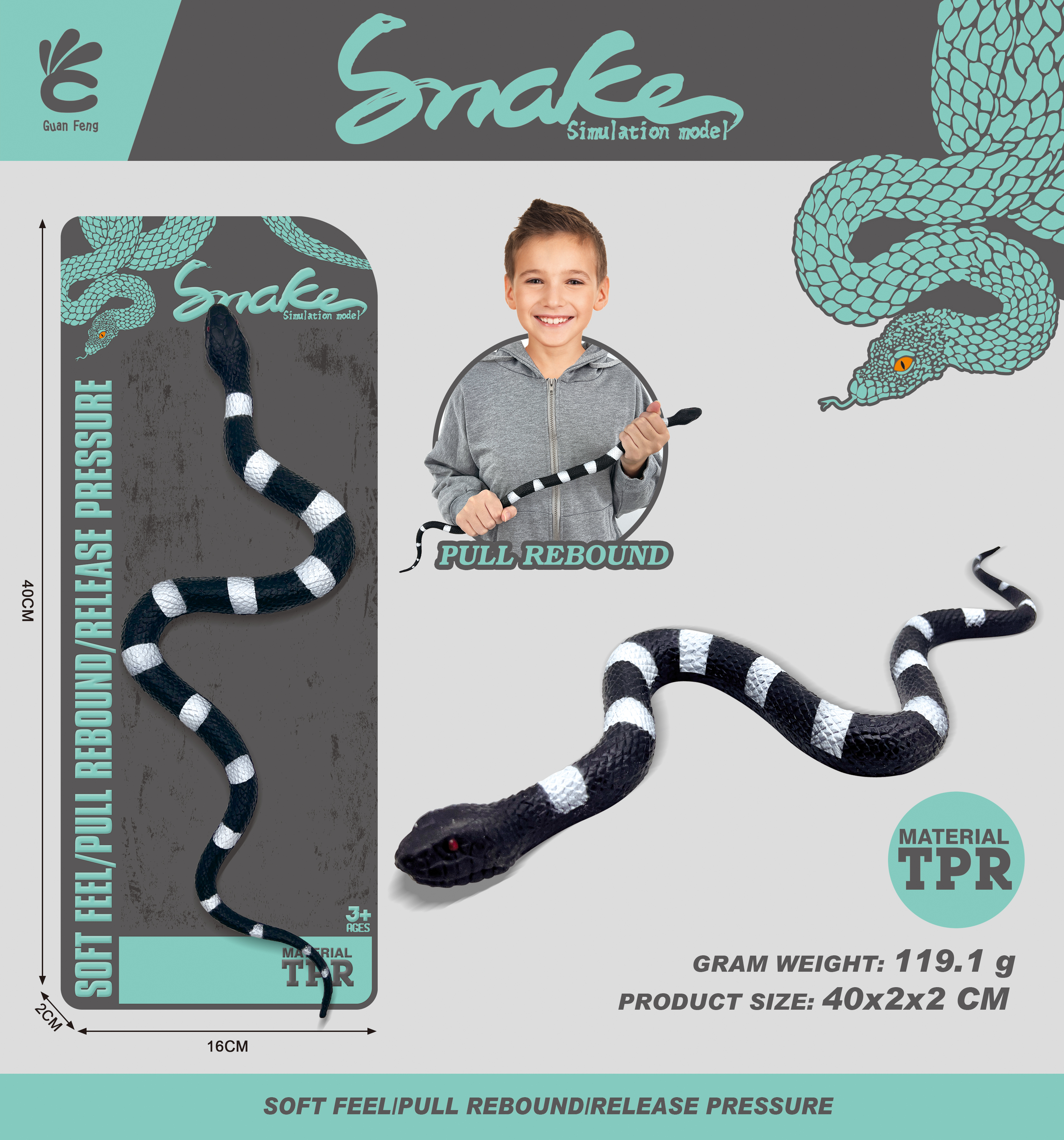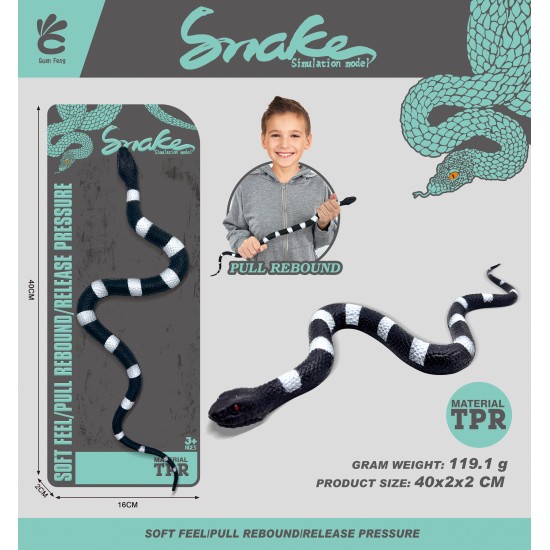 Adauga o piesa exotica colectiei tale cu figurina elastica Sarpe Bandy-Bandy! Aceasta jucarie interactiva impresioneaza prin lungimea sa de 40 cm si designul realist cu inele contrastante alb-negru, specific speciei reale. Fabricat din material TPR (cauciuc termoplastic) premium, sarpele este extrem de moale si flexibil, permitand intinderi uimitoare fara a-si pierde forma.