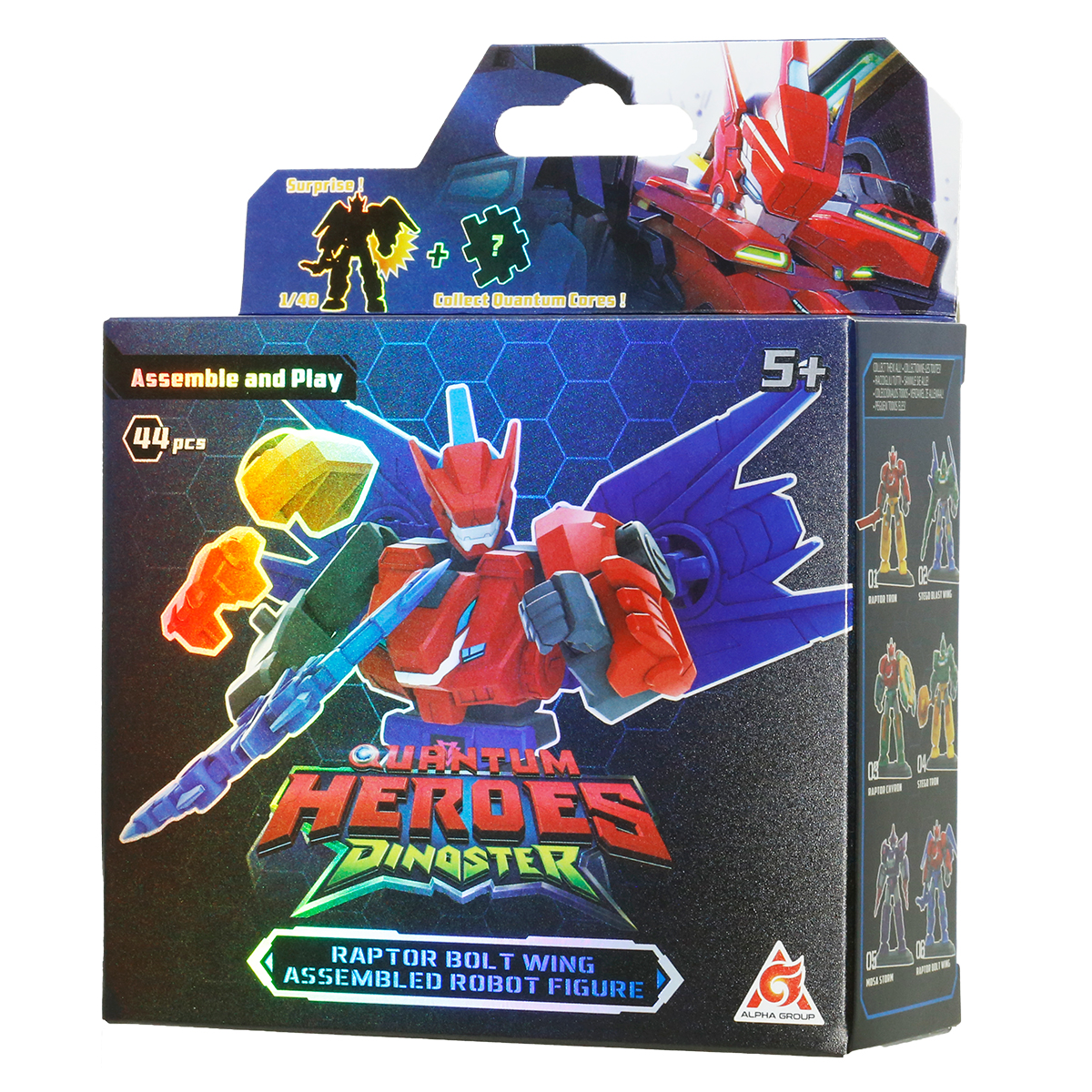 Setul include si un element special din Nucleul Cuantic cu imaginea eroului principal. Colecteaza toti eroii din serie ca sa completezi Nucleul Cuantic! Piesele au margini care se imbina intre ele, astfel incat poti crea un cub. Robotul se construieste din 44 piese, iar partile pot fi combinate cu alte personaje Dinoster pentru a crea un robot nou si original.
