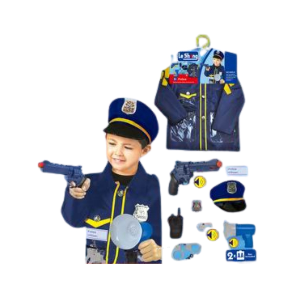 Un set creativ si educativ ce le ofera copiilor posibilitatea de a intra in rolul unui ofiter de politie. Setul include o uniforma de politist, formata dintr-o tunica si pantaloni de culoare albastra, care imita perfect echipamentul unui politist real.
