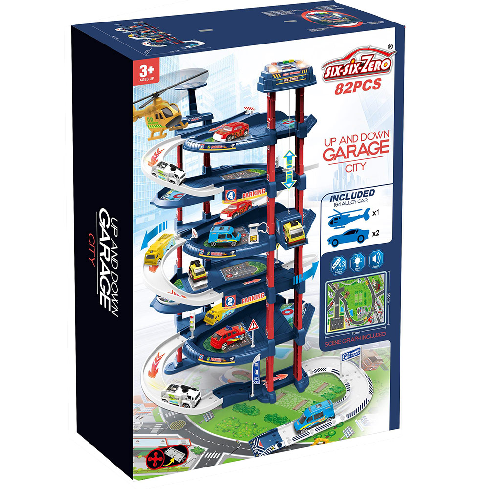 Un set complex si interactiv, creat pentru a oferi copiilor o experienta captivanta de joaca. Setul reprezenta un garaj multi-etajat si o parcare, cu diverse rampe de acces, piste si locuri de parcare. Setul include 82 de elemente pentru crearea unui mediu de joaca complet.