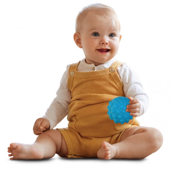 Fiecare mingie are o suprafata unica: de la proeminente fine pana la tepi moi, care activeaza receptorii tactili si ajuta copilul sa exploreze lumea prin atingere. Culorile vii incurajeaza invatarea culorilor si formelor in timpul jocului. Mingile se strang usor, antrenand muschii palmelor si imbunatatind coordonarea mana-ochi.