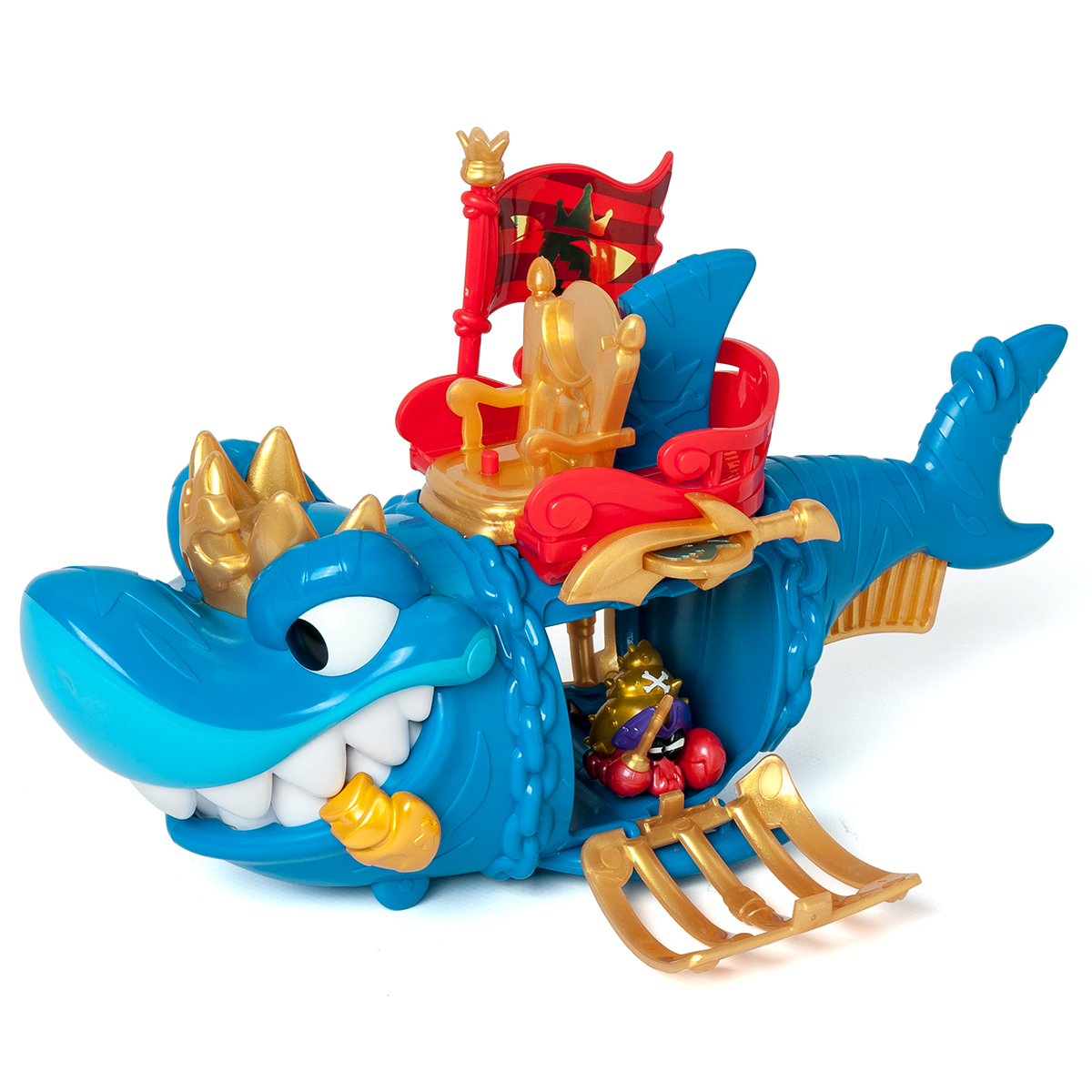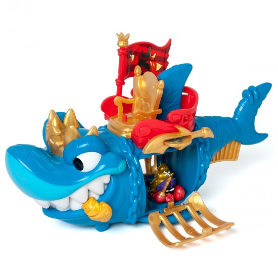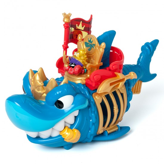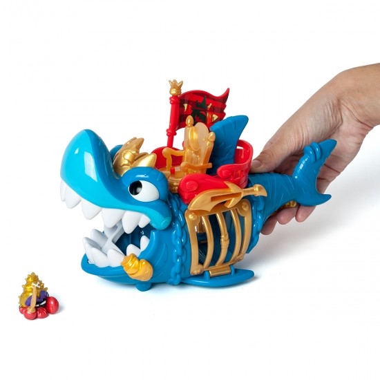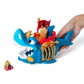 " Mecanism interactiv: apasa aripioara-levier aurie pentru a deschide gura rechinului si a captura pirati