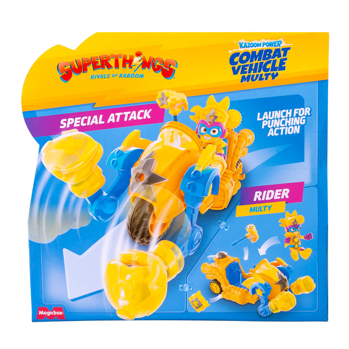 Bine ai venit in orasul Kaboom, unde eroii si raufacatorii SuperThings traiesc aventuri pline de actiune! Bam-bam! Urca in vehiculul de lupta din seria Combat Vehicles cu setul SuperThings - Multi-Masina si porneste spre misiuni spectaculoase. Aceasta masina super puternica te duce rapid la destinatie si iti deschide drumul printre obstacole, ca intr-un film de actiune.