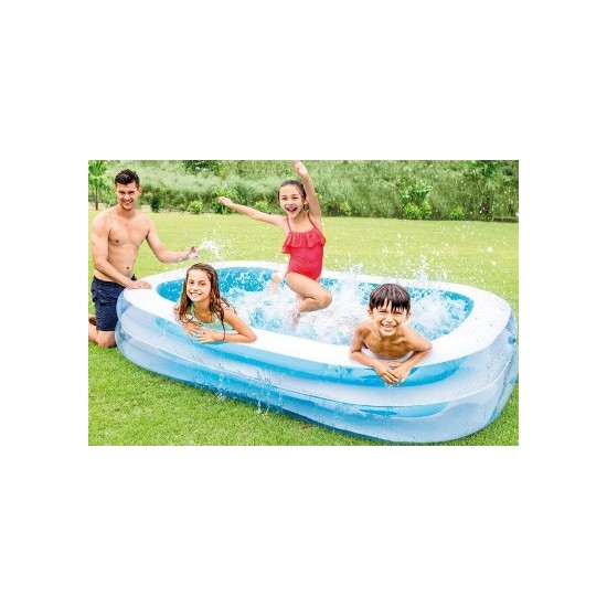 Piscina gonflabila mare, cu pereti grosi, semi-transparenti. Este echipata cu doaг camere de aer si supape duble pentru siguranta maxima. Datorita dimensiunilor sale generoase, intreaga familie se poate bucura de balaceala iar peretii rezistenti suporta cu usurinta o incarcare mai mare.