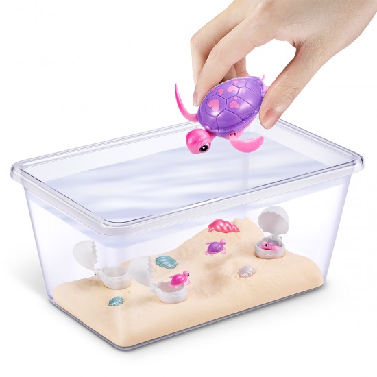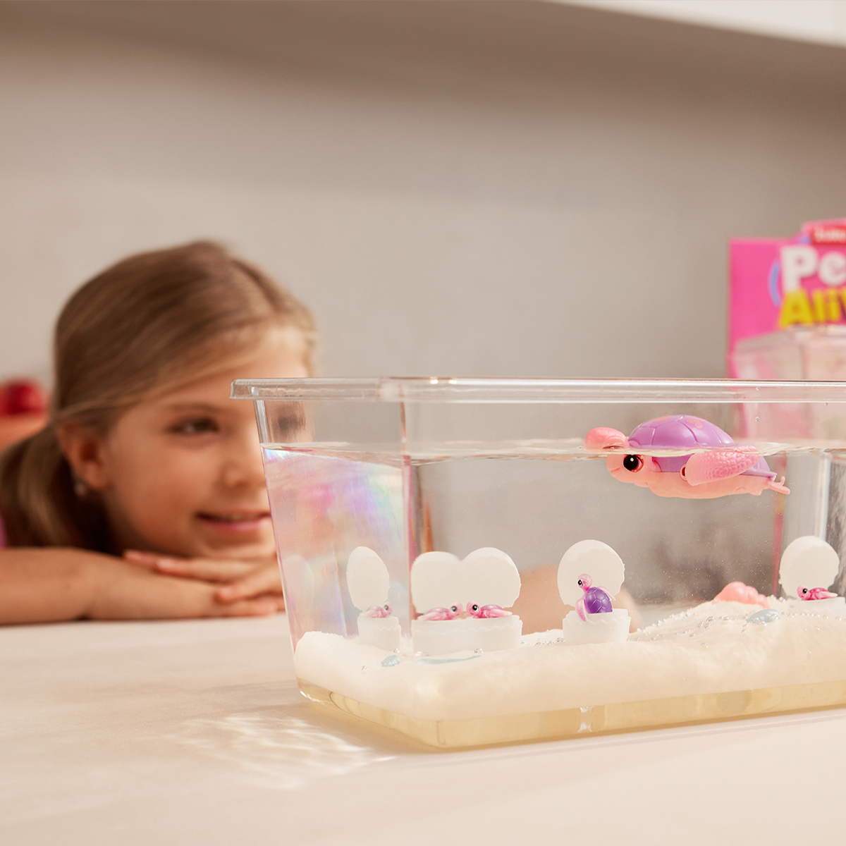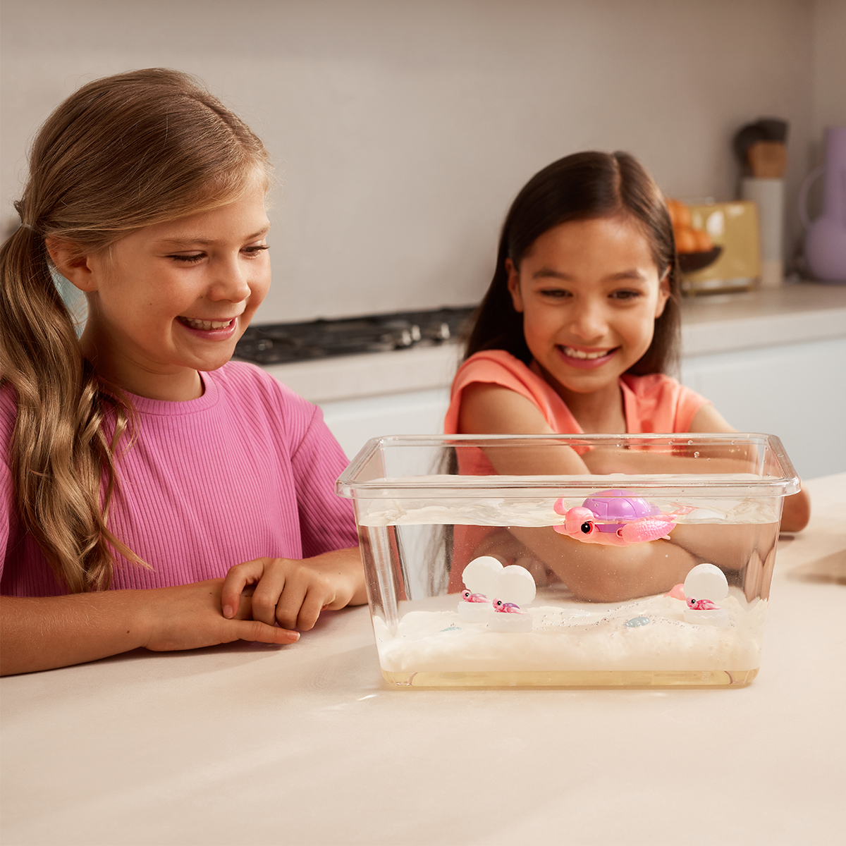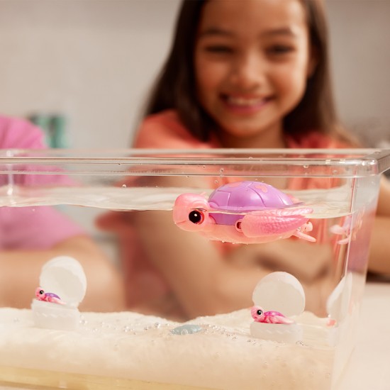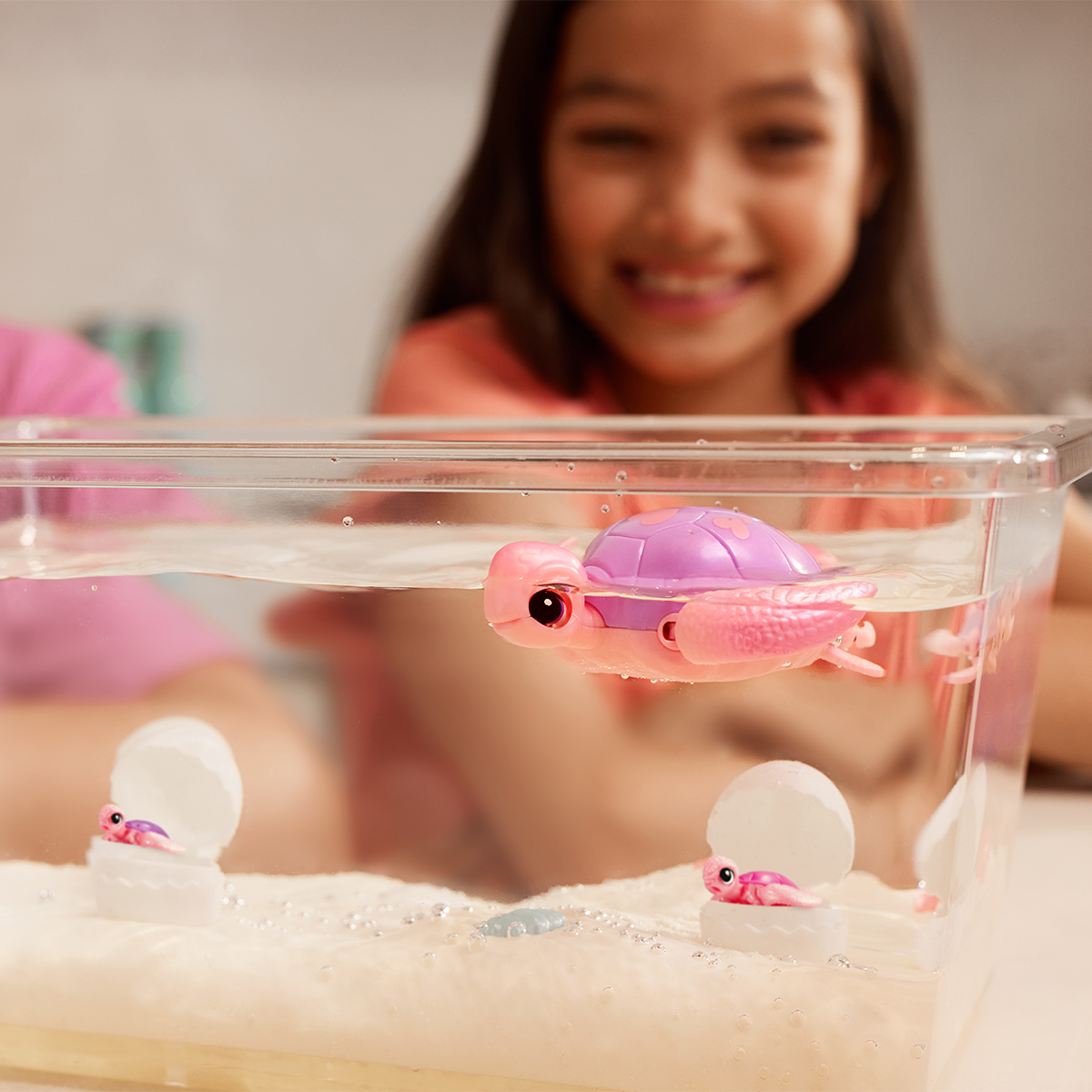Mama testoasa inoata in apa si se misca asemenea unei creaturi reale. Puii se pot prinde de ea formand un sir adorabil, iar in timpul deplasarii acestia o urmeaza, creand un efect vizual spectaculos. Micile testoase plutesc la suprafata, transformand jocul intr-o scena acvatica plina de viata. Acvariul face parte din experienta, permitand copiilor sa observe, sa se joace si sa repete experimentul oricand - ouale pot fi inchise manual pentru o noua runda de surprize.