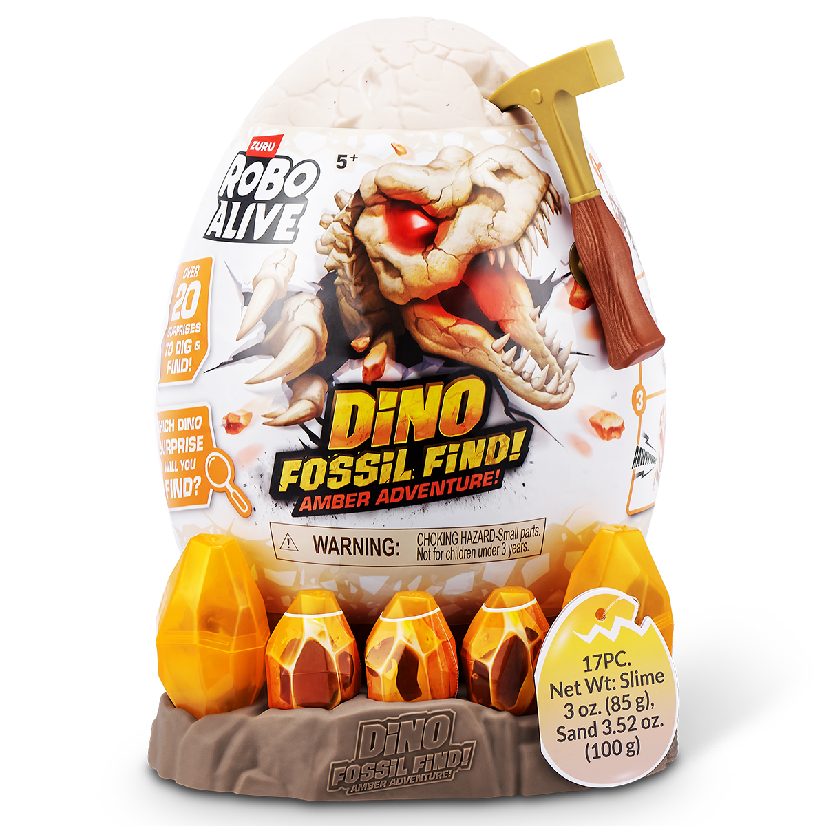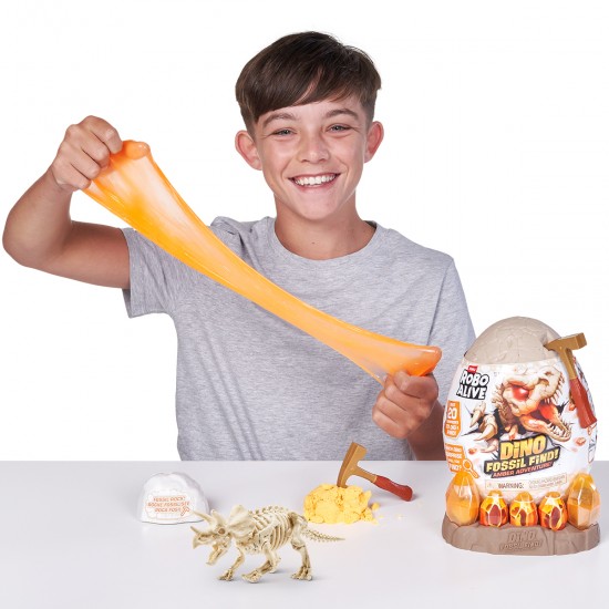 Setul interactiv surpriza Robo Alive - Dino Fosil Find cu schelet de dinozaur este cadoul perfect pentru micii pasionati de dinozauri si arheologie! In interiorul unui ou urias se ascund piese de schelet de dinozaur, iar copilul trebuie sa le descopere ca un adevarat paleontolog: in slime, in nisip kinetic si chiar intr-un "bloc de piatra". Gaseste toate elementele si construieste propriul schelet de dinozaur!