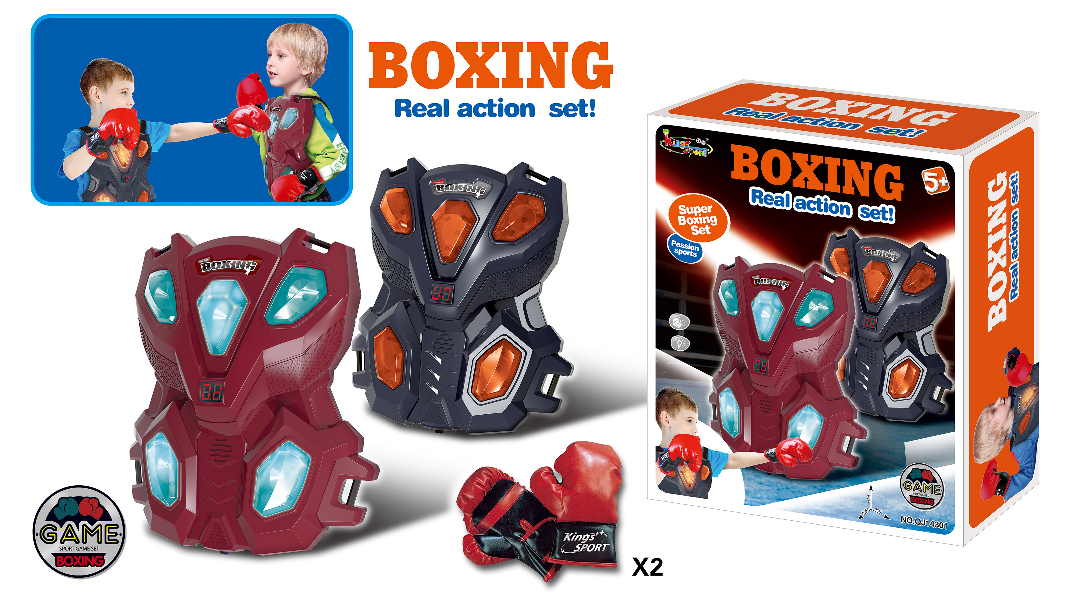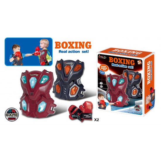 Transforma energia in performanta cu setul de box "Real Action"! Aceasta jucarie interactiva este proiectata pentru a oferi copiilor o experienta de antrenament captivanta si sigura. Setul include doua veste electronice (una visinie si una neagra) dotate cu senzori de impact, afisaj LED pentru scor si puncte luminoase care indica unde trebuie aplicata lovitura.