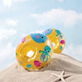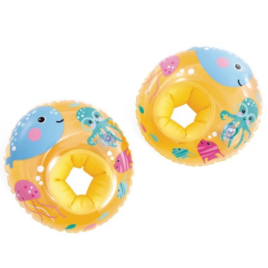 Aripioarele gonflabile Intex Little Sea Pals sunt accesoriul perfect pentru a-i ajuta pe cei mici sa capete incredere in apa intr-un mod sigur si distractiv. Cu un design vesel, colorate intr-un galben stralucitor si decorate cu personaje marine simpatice, acestea asigura o vizibilitate sporita in piscina sau la mare. Fiecare manseta este dotata cu doua camere de aer separate, oferind un strat suplimentar de siguranta si o flotabilitate optima. Forma ovala si materialul moale permit o fixare confortabila pe brate, oferindu-le copiilor libertatea de miscare necesara pentru a invata primele miscari de inot sub supravegherea adultilor.