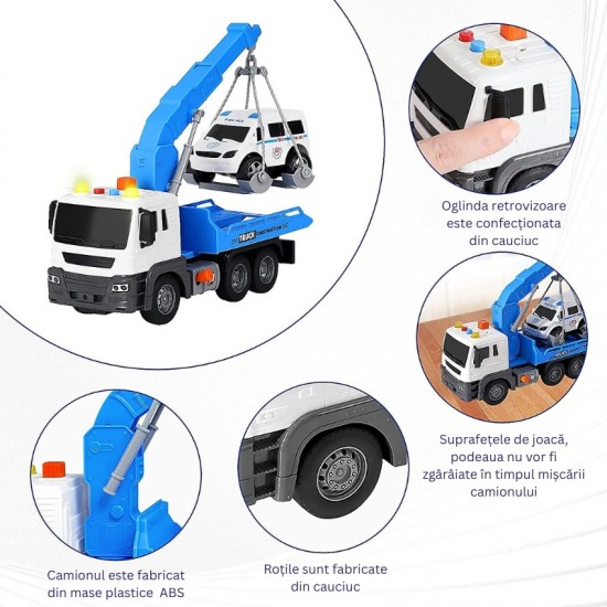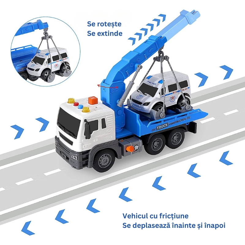 Evacuatorul albastru cu macara este o jucarie interactiva complexa, ideala pentru copiii pasionati de vehicule utilitare si interventii rutiere. Realizat la scara 1:16, acest model se remarca prin designul modern, culorile atractive si functionalitatile multiple. Este echipat cu mecanism cu frictiune pentru deplasare usoara, macara mobila pentru ridicarea vehiculelor, precum si cu buton de presiune care activeaza efecte sonore si luminoase realiste. Jucaria permite simularea situatiilor reale de tractare si asistenta rutiera, stimuland jocurile de rol, imaginatia si coordonarea copilului. Constructia solida si detaliile bine realizate fac din acest evacuator o alegere excelenta pentru joaca zilnica, dar si pentru completarea colectiilor de vehicule speciale.