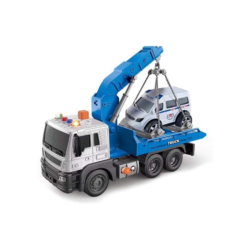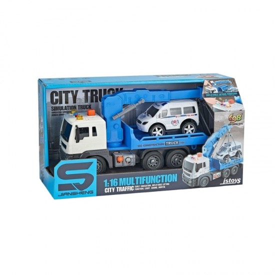 Evacuator albastru cu macara si frictiune, buton presiune, sunete si lumini, 1:16, JSTOYS, ZJA278624