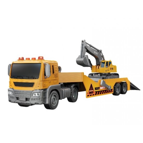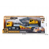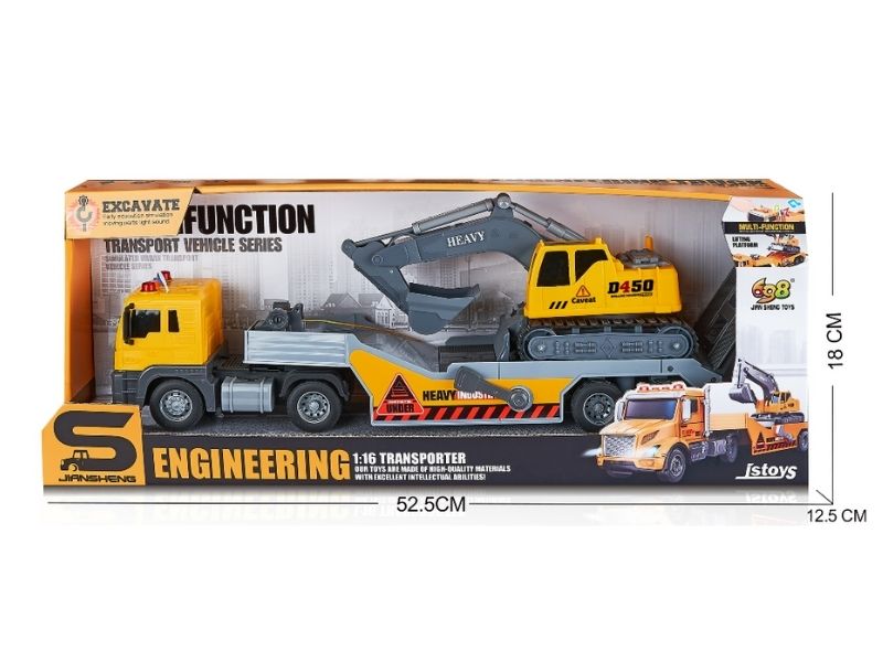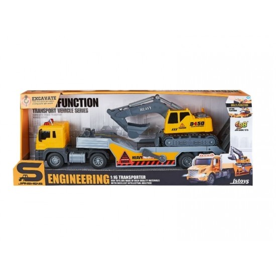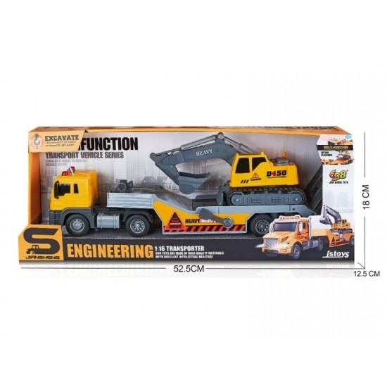 Camion transportator cu excavator, frictiune, sunete si lumini, 1:16, JSTOYS, ZJA375400