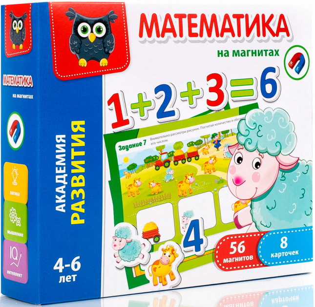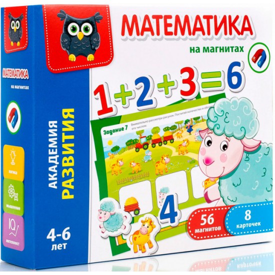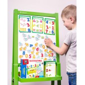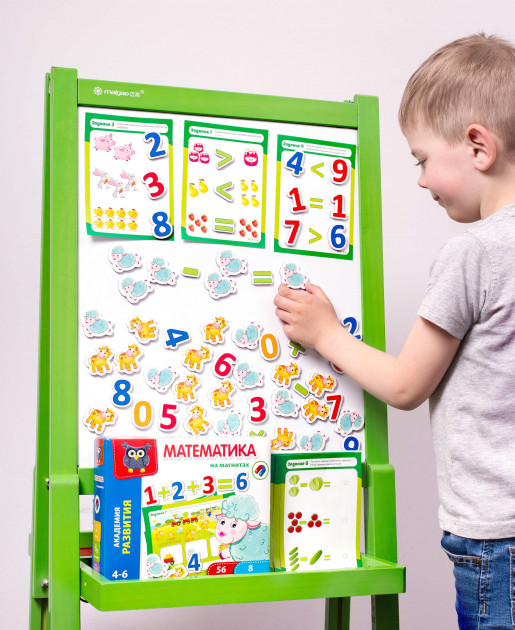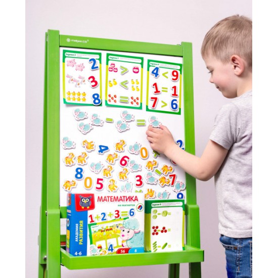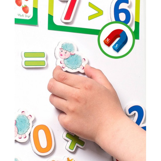 Cifre magnetice, semne, animalute si cartonase cu cladiri. Alcatuim inegalitatile, rezolvam exercitiile, indeplinim sarcinile de pe cartonase. Toate cifrele si semnele se dubleaza. Caracteristici: 56 magneti, 8 cartonase.