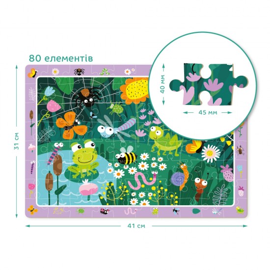 Что делают насекомые, прячась в глубине сада, где их не видно? Конечно, я устраиваю сумасшедшую вечеринку. Они украшают цветами все вокруг и собираются вокруг пруда. Вы видели всех насекомых? Особенностью пазла-наблюдения является цветная рамка, на которой изображены элементы пазла. Задача ребенка - найти изображения из рамки на большом пазле. Игра с таким пазлом учит детей обращать внимание на детали и скорость реакции.