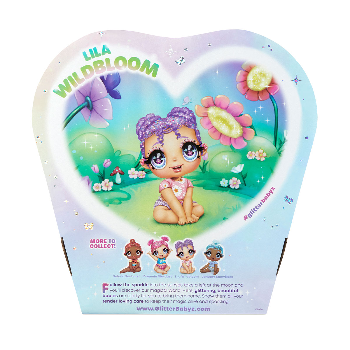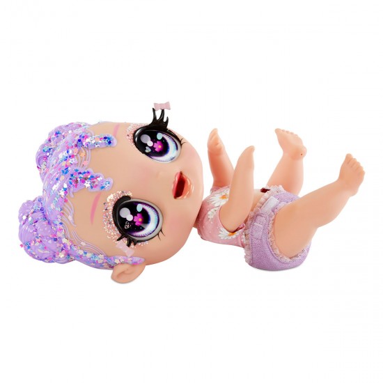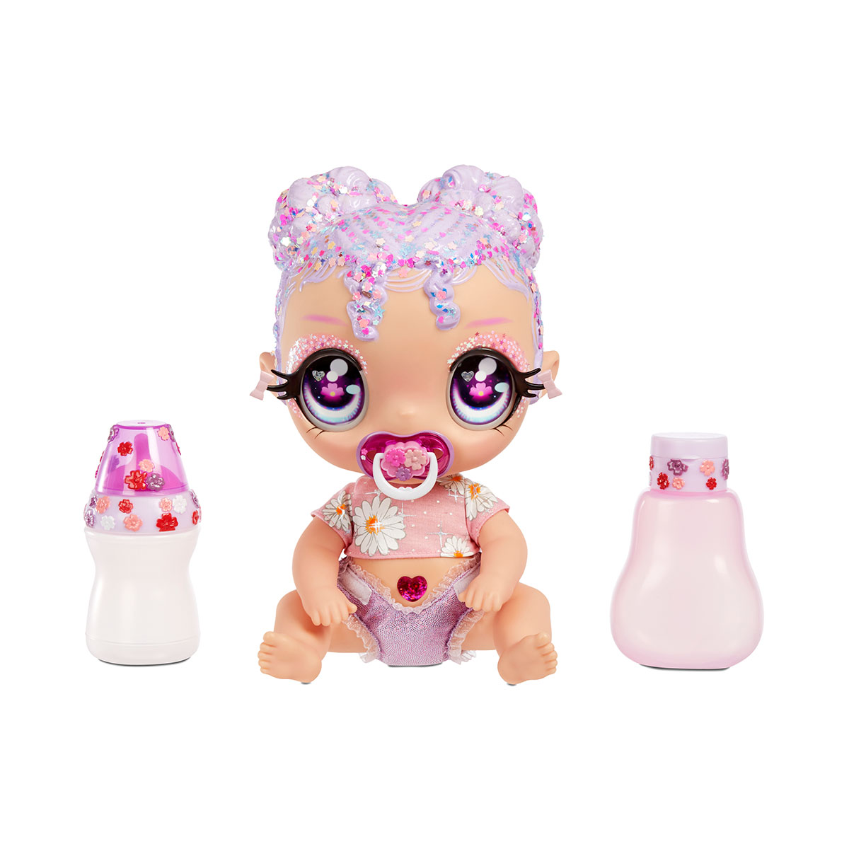 Игровой набор с куклой GLITTER BABYZ - ЛИЛИЯ - это милая блестящая куколка, которая умеет пить из бутылочки и мочить пеленки. Крошка украшена блестками, одежда и внешний вид соответствуют ее сказочному имени. Ножки и ручки куколки двигаются. И самое главное - волосы, бутылочка с соком и бутылочка с шампунем меняют цвет в холодной воде!