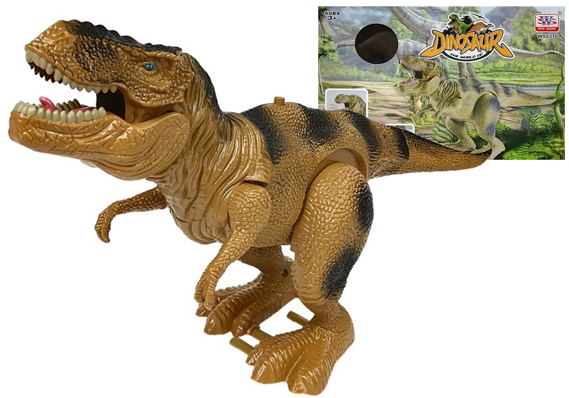 Замечательная подвижная фигура тираннозавра рекса поможет ребенку погрузиться в увлекательный мир динозавров и захватывающих приключений. Прекрасно проработанные детали игрушки усилят эффект. Он двигает лапами и челюстью, при нажатии на датчики издает грозное рычание, а глаза загораются красным светом. Изготовленo из пластика.