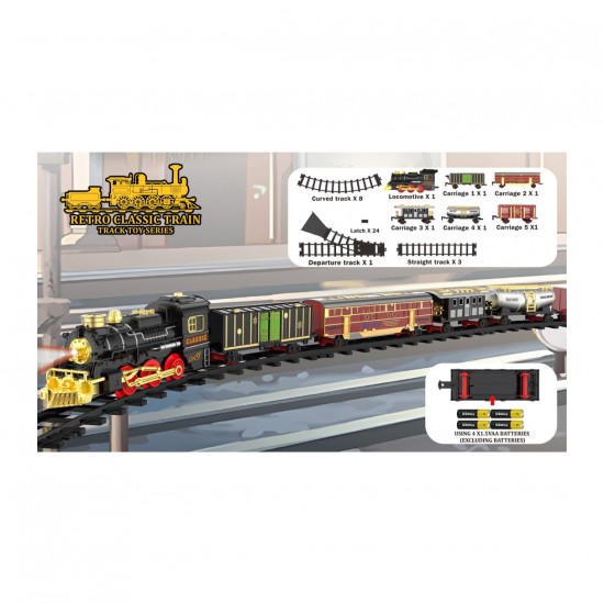 Набор состоит из элементов, выполненных с высокой точностью и красивой отделки, которые можно компоновать по своему усмотрению. Кроме того, поезд излучает дым, световые и звуковые эффекты.