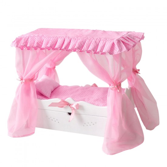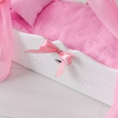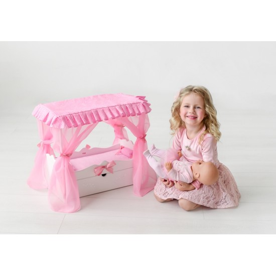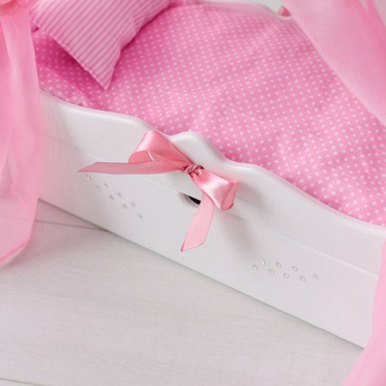 Кроватка для куклы с выдвижным ящиком для удобства хранения аксессуаров коллекции "Diamond princess" выполнена в бело-розовой цветовой гамме и украшена сияющими стразами и нарядными атласными лентами.