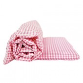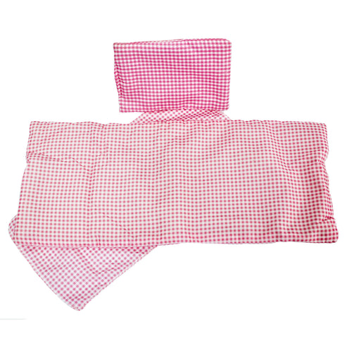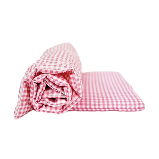 Детская кроватка укомплектована бело-розовым постельным бельем.
