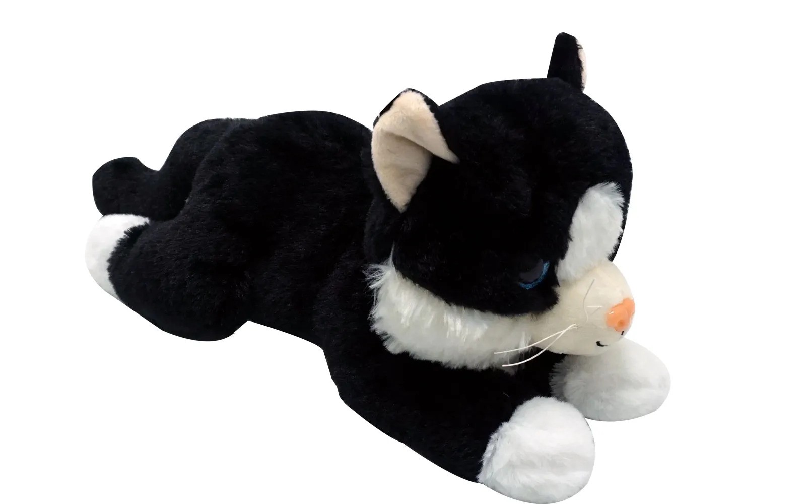 Эта игрушка лежащей позы длиной около 35 см изготовлена из приятного на ощупь мягкого плюша, имеет длинные белые усики, маленькие лапки и носик в форме сердца.
