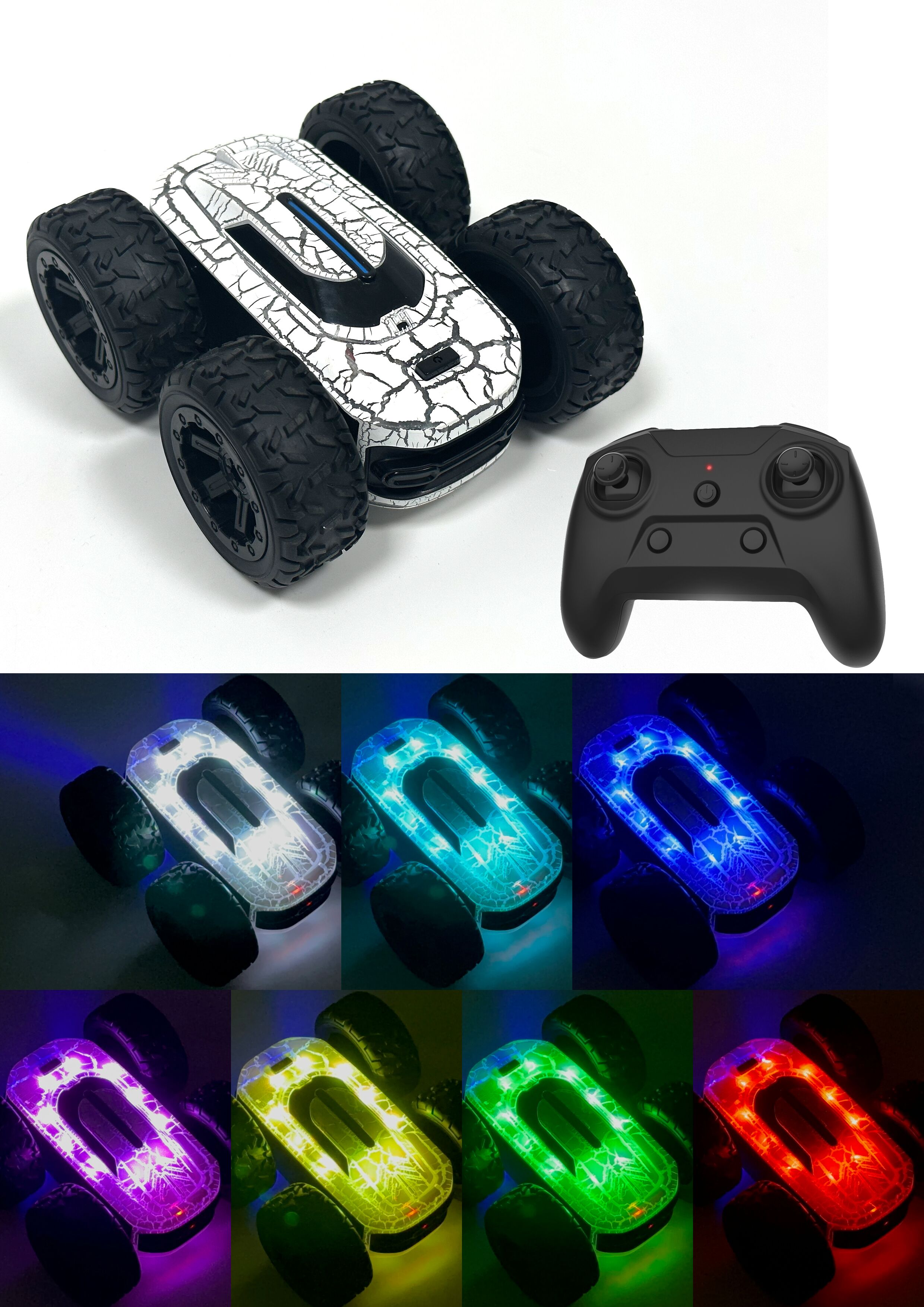 - Автомобиль движется во всех направлениях и имеет разноцветные светодиодные световые эффекты, создавая захватывающие впечатления от игры.