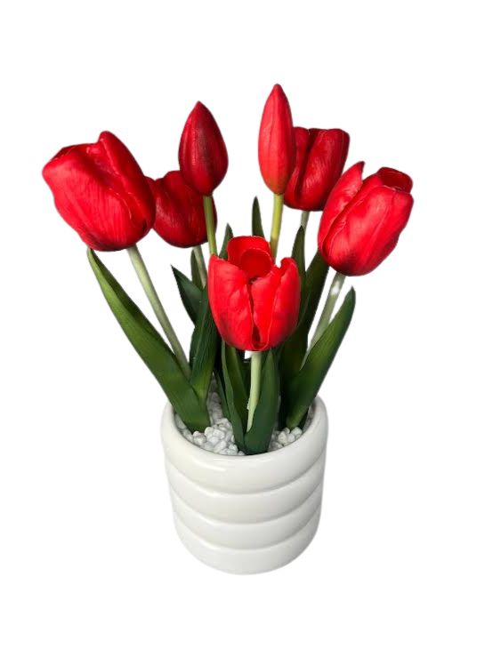 Искусственные тюльпаны в горшке 31 см, красные, модель ZJA361811 - это стильная декоративная композиция для дома, офиса или коммерческих помещений. В набор входят несколько реалистичных красных тюльпанов с зелеными листьями, размещенных в белом декоративном горшке с декоративными камешками.