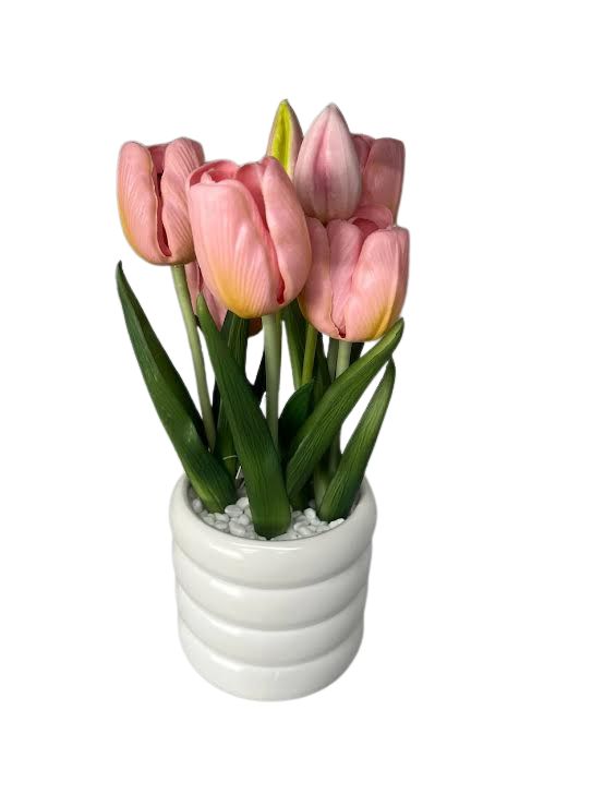 Искусственные тюльпаны в горшке 31 см, розовые, модель ZJA361811 - это стильное декоративное решение для дома, офиса или коммерческих помещений. Композиция состоит из нескольких розовых тюльпанов с реалистичными зелеными листьями и размещена в декоративном белом горшке с декоративными камешками.