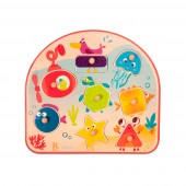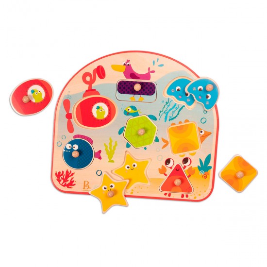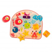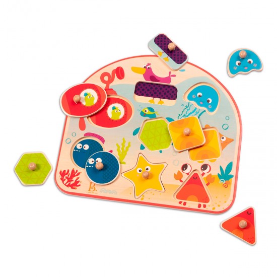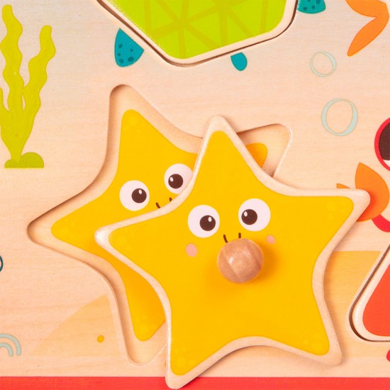 Cделанная из гладкого натурального дерева, эта рамка-вкладыш позволит маленькому исследователю подводного мира погрузиться в глубины морей и узнать больше об их обитателях, таких как медуза, морская черепаха, краб и других. Каждая деталь удобно ложится в маленькую ручку, а цветные иллюстрации на рамке помогут быстрее найти правильное место.