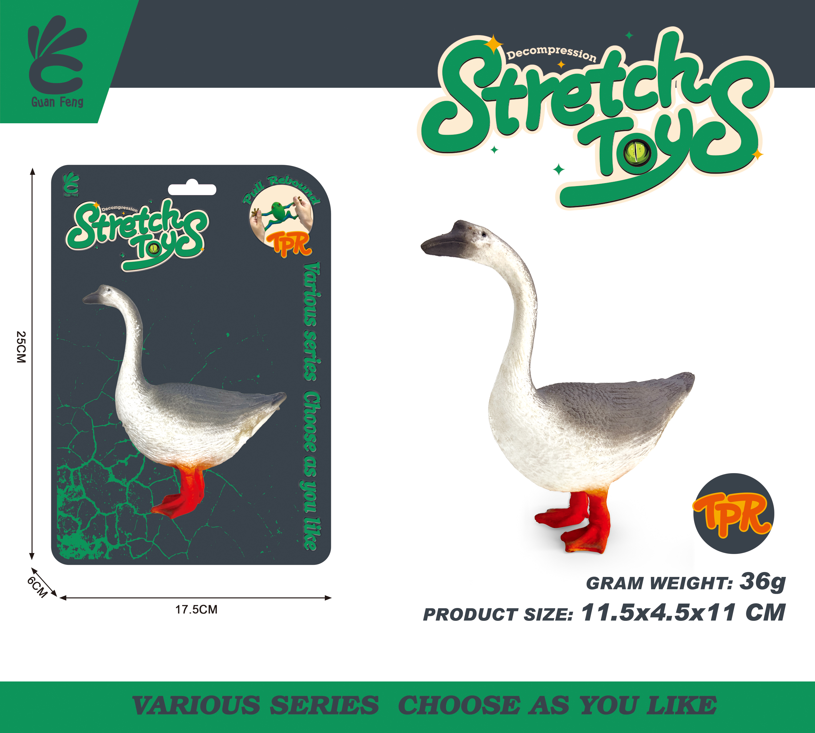 Откройте для себя радость тактильной игры с эластичной фигуркой Гуся! Эта симпатичная игрушка изготовлена из высококачественного материала TPR (термопластичный каучук), что делает её очень мягкой и податливой. Дети могут растягивать, сжимать или скручивать её, и фигурка всегда будет возвращаться в свою первоначальную форму.