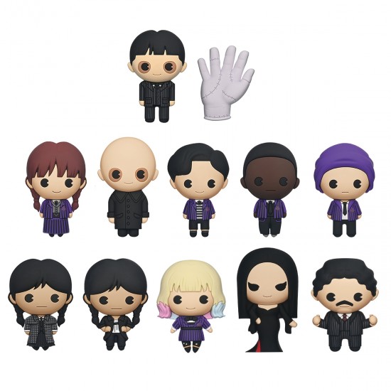 " 12 персонажей, среди которых 2 редких: Уэнздей (в школьной форме), Уэнздей (в повседневной одежде), Агнес, Энид, Мортиша, Гомес, Фестер, Пагсли, Бьянка, Аякс, Ларч (редкий), Рич (редкий)