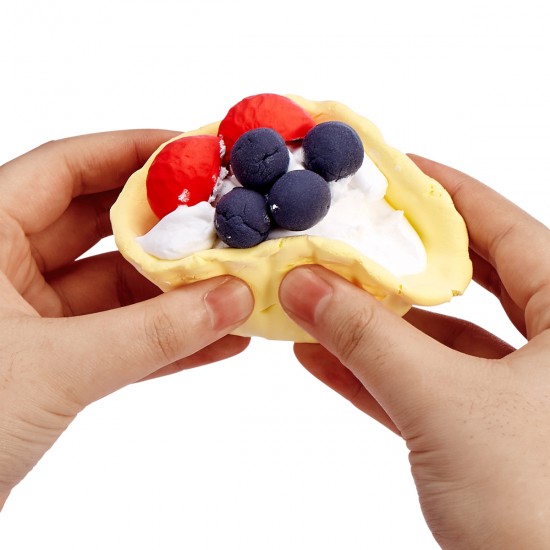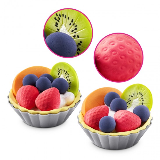 В комплект входят разноцветный слайм, смесь слайм-ингредиентов для фруктов, формы для тартов и клубники, активатор для слайма, различные аксессуары и инструкция, обеспечивая полноценный игровой процесс. Игра с набором развивает воображение, мелкую моторику и творческие способности.