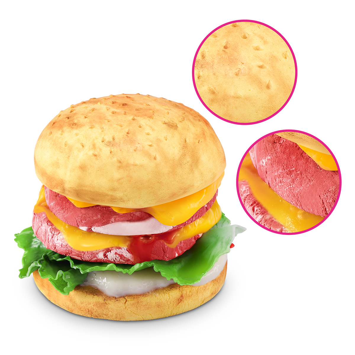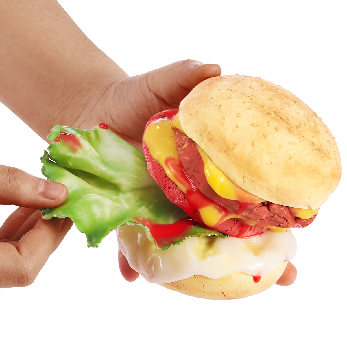 Комплект включает разноцветный и текстурированный слайм, элементы для моделирования булочки, "мяса", сыра и овощей из слайма, а также дополнительные тематические аксессуары, способствующие развитию воображения и сенсорного восприятия. Игра со слаймом развивает творческие навыки, мелкую моторику и воображение.