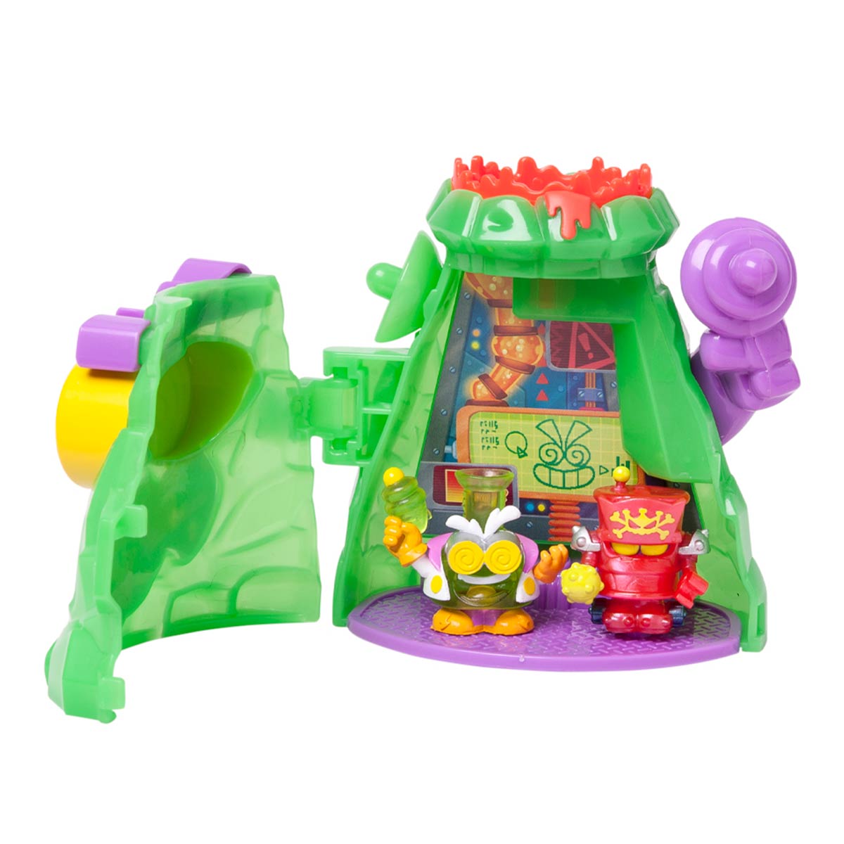 База выполнена в виде вулкана-лаборатории. Откройте секретный вход - полускрытая стрелочка подскажет нужное место. Внутри лаборатории спрятана крутая функция - скрытая катапульта. Поставьте фигурку Роботоксика в кратер вулкана, опустите рычаг и наблюдайте эффектный запуск!