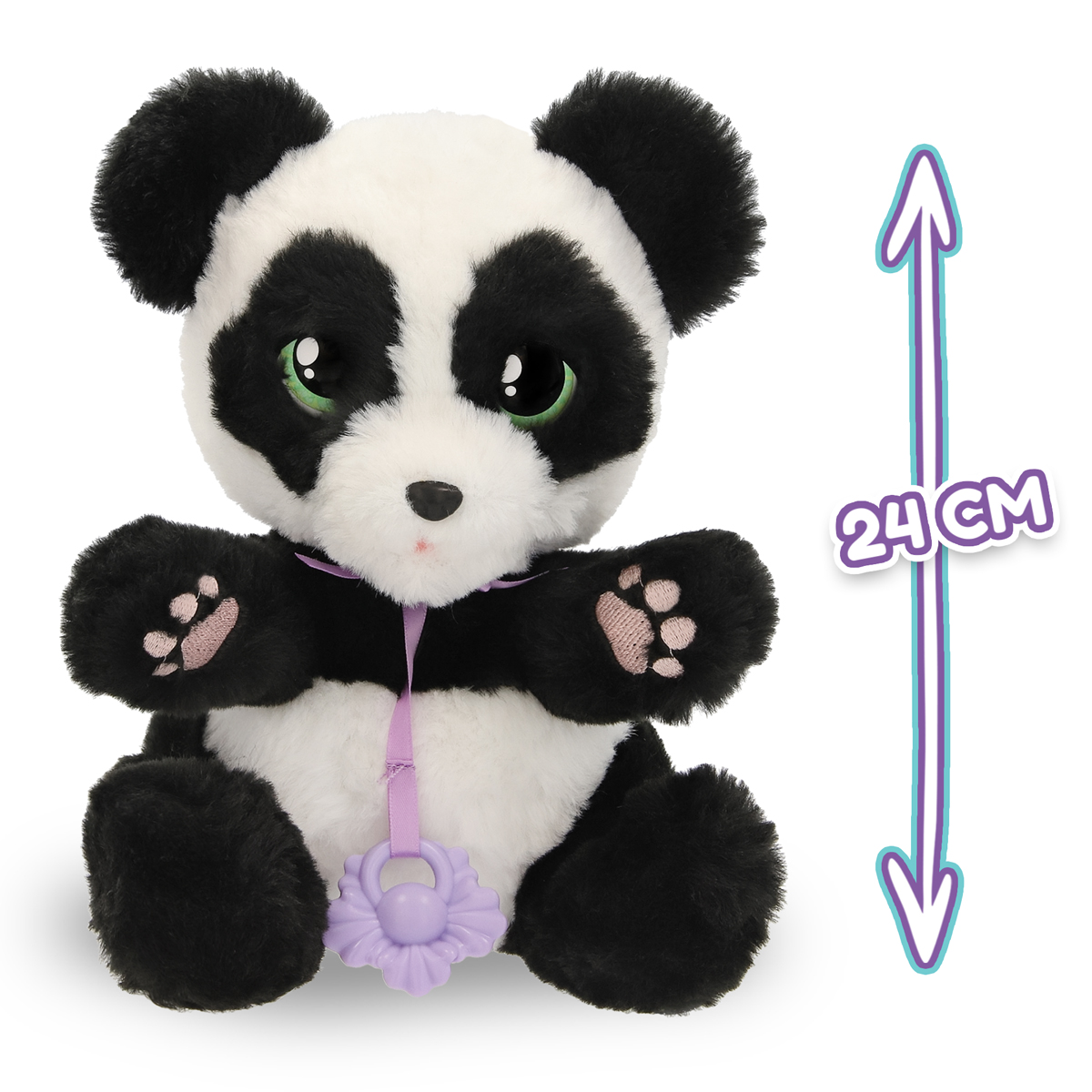 Игрушка реагирует, когда вы вставляете пустышку в ротик панды - она издает милые звуки, а её глазки механически открываются и закрываются, создавая эффект живого питомца. Кроме того, панда поставляется с мягкой сумкой-одеялом, которая служит и местом отдыха, и аксессуаром для переноски любимца.