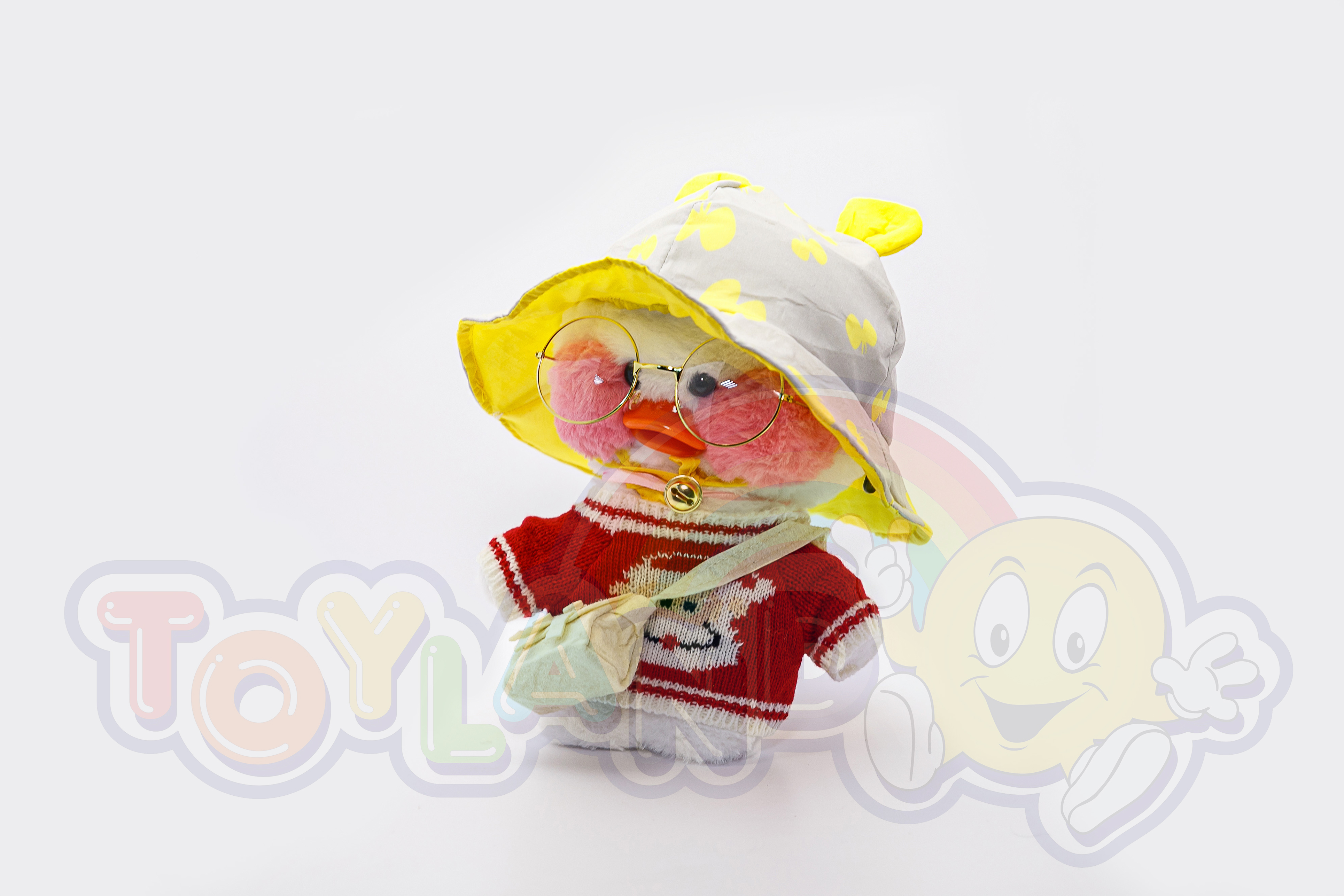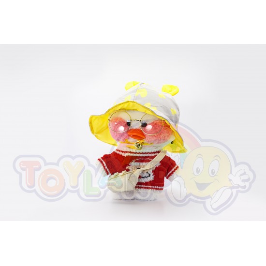 Утенок LaLafanfan - милая плюшевая игрушка со стильной одеждой (очки в золотой оправе, сумка, ожерелье и желтая шапка в горошек).